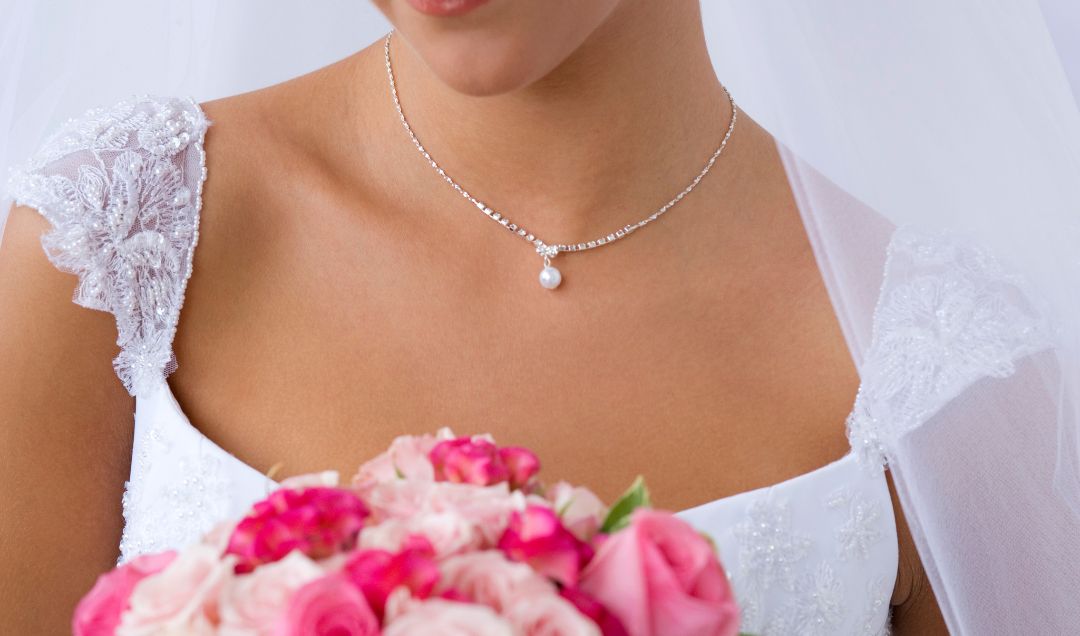 Jeśli zdecydujesz się na naszyjnik, najlepiej postawić na delikatny łańcuszek lub subtelną celebrytkę, która nie wpada pod materiał i nie będzie zbyt ciężka. Należy unikać długich naszyjników, które mogą gubić się w fałdach tkaniny.