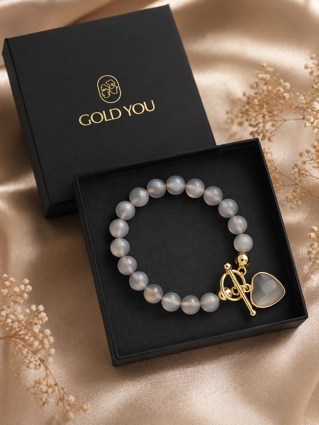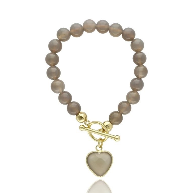 Subtelna i elegancka bransoletka wykonana z naturalnego agatu w delikatnym, szarym odcieniu. Kamienie o lekkiej transparentności pięknie odbijają światło, tworząc efekt miękkiego blasku, a złote detale dodają całości wyrafinowanego charakteru.