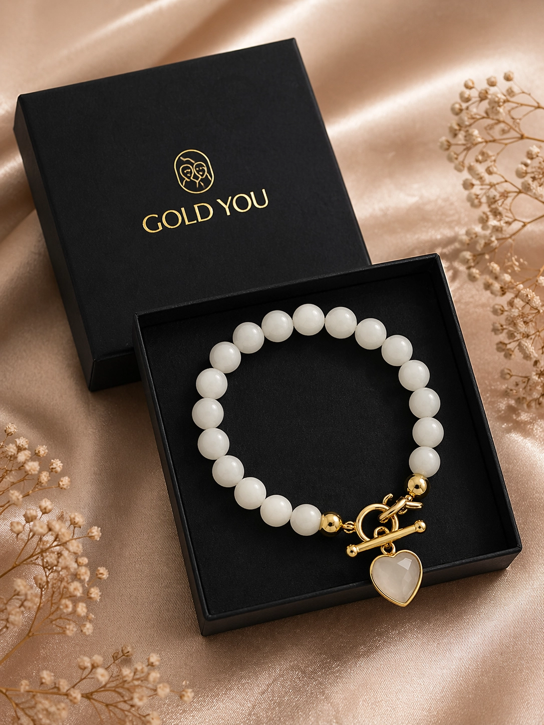Delikatna bransoletka wykonana z naturalnego jadeitu w subtelnym, mlecznobiałym kolorze. Gładkie, matowe kamienie tworzą harmonijną i elegancką całość, a złote detale z ozdobnym zapięciem i zawieszką w kształcie serca dodają jej wyjątkowego uroku.