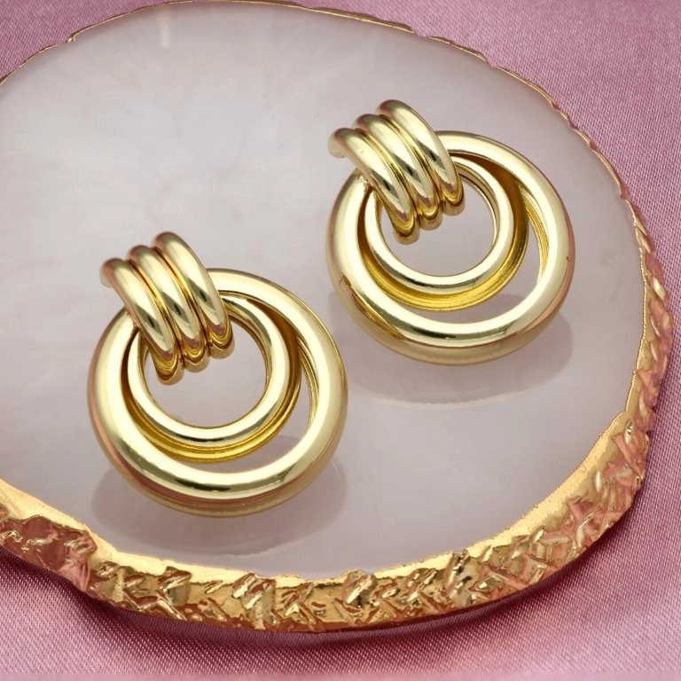 Wyraziste kolczyki o geometrycznym kształcie, które łączą minimalizm z charakterem. Podwójne okręgi i subtelne detale tworzą nowoczesną formę, która przyciąga spojrzenia i podkreśla rysy twarzy.
