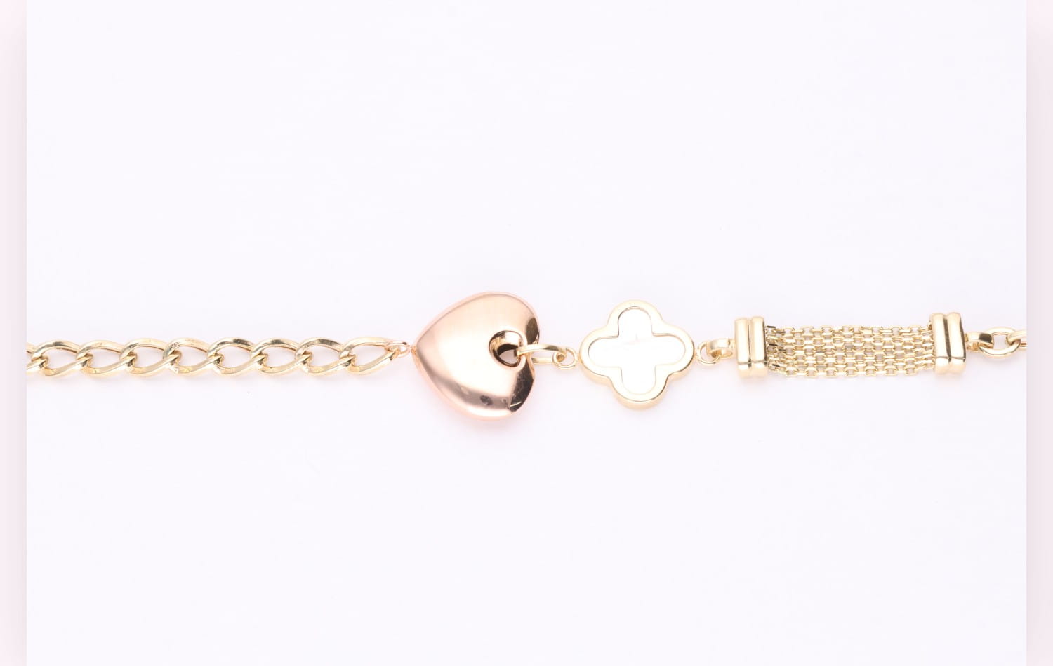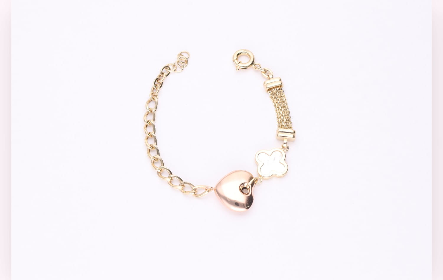 Amore to bransoletka, która łączy w sobie trzy symbole elegancji: połyskujące złoto, subtelną masę perłową i lustrzane serce. Ten projekt zachwyca swoją kompozycją – każdy element ma swoje miejsce i tworzy harmonijną, romantyczną całość. Centralne serduszko o gładkiej, wypukłej powierzchni odbija światło niczym małe zwierciadło, dodając bransoletce wyjątkowego blasku.