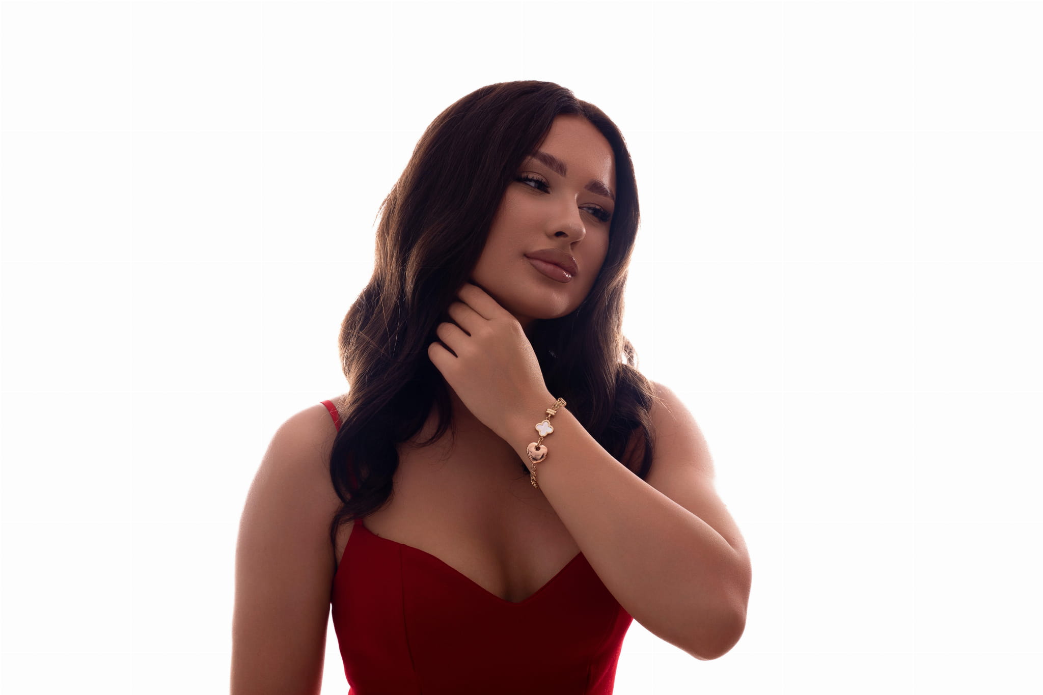 Delikatny czterolistny motyw z masy perłowej w złotej oprawie nadaje projektowi lekkości i szlachetności. Jego miękkie refleksy kontrastują z wyrazistą formą serduszka, tworząc elegancki dialog kształtów. Amore idealnie układa się na nadgarstku, podkreślając jego linię i dodając stylizacji nuty romantycznej elegancji.