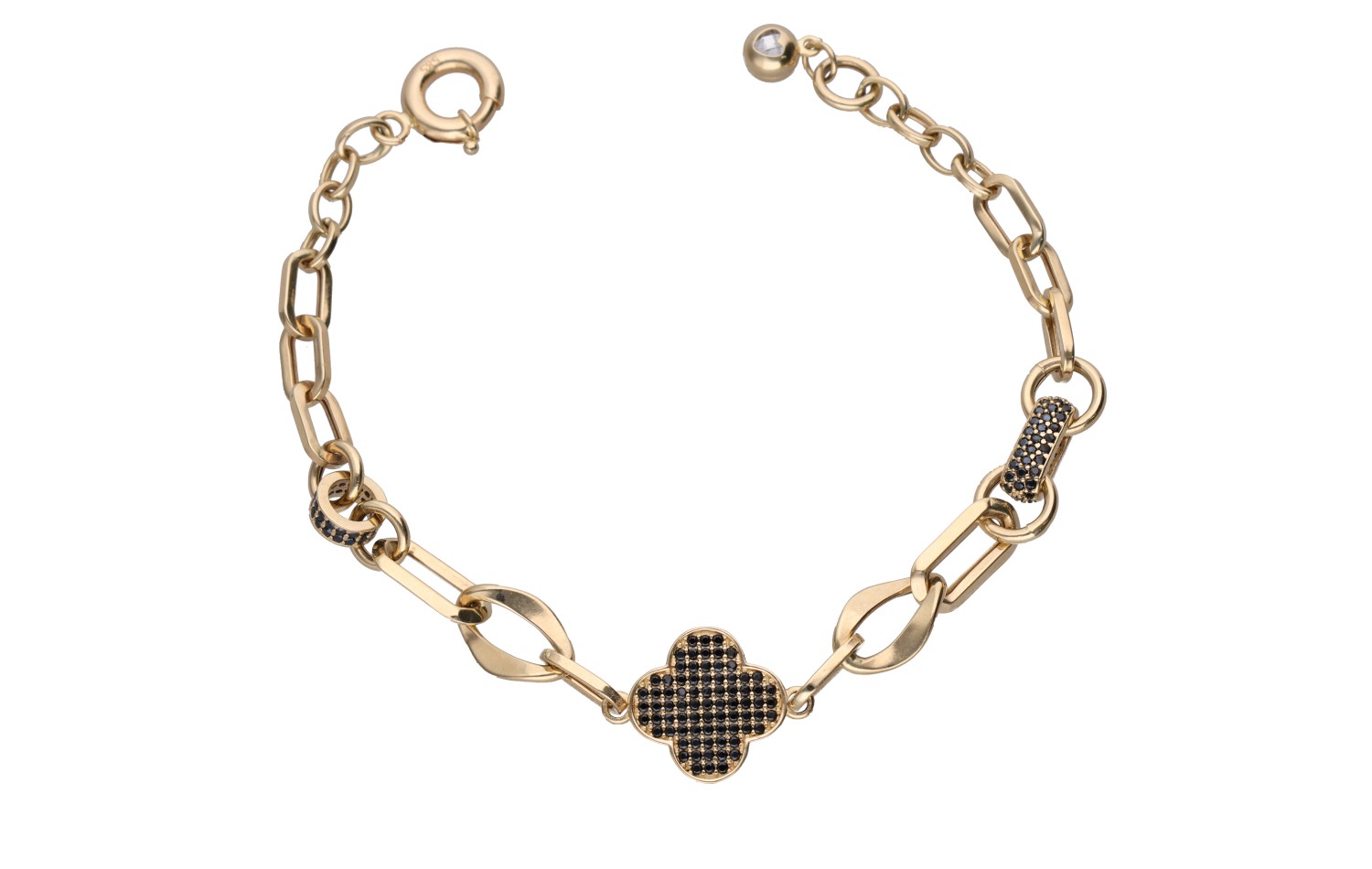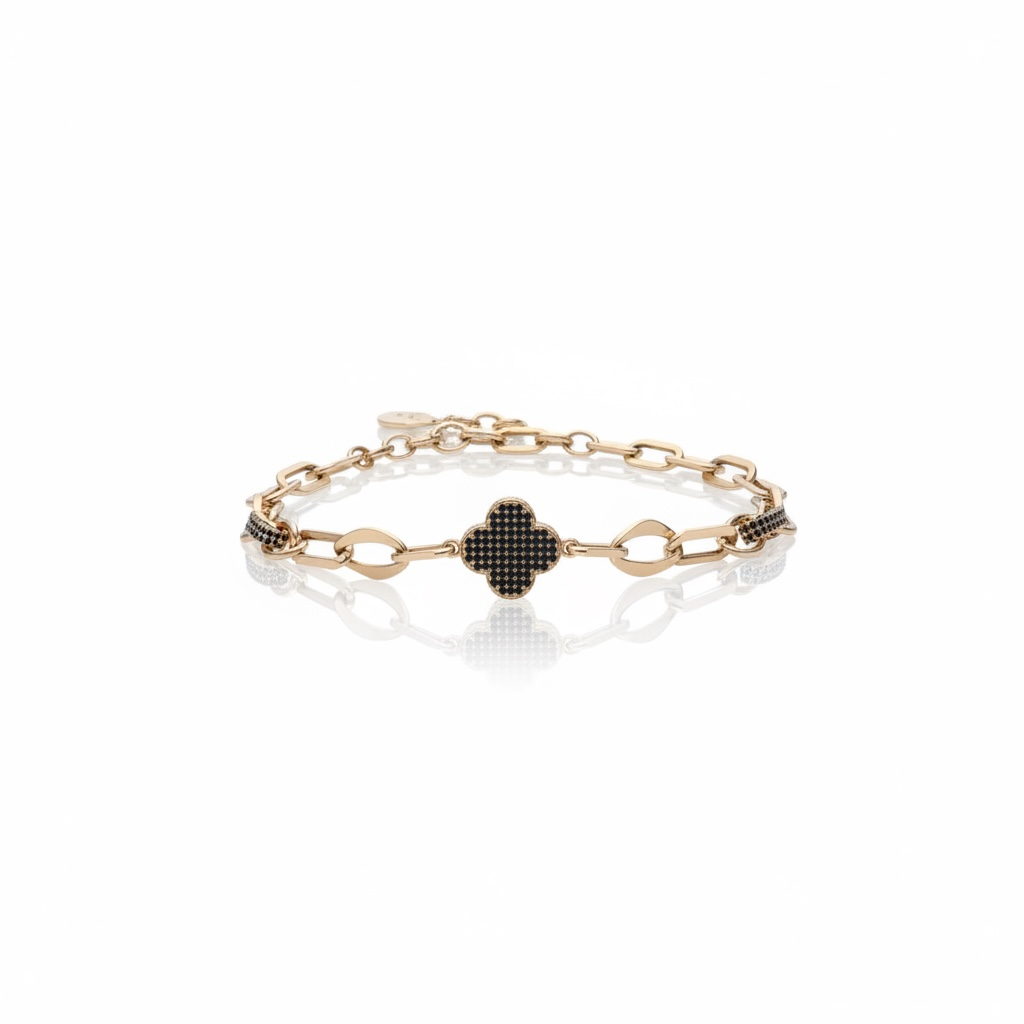 Bransoletka Drama przyciąga uwagę wyrazistym kontrastem złota i ciemnych kamieni, które tworzą elegancką, a jednocześnie odważną kompozycję. Centralny motyw w kształcie koniczyny wysadzany drobnymi kamieniami nadaje biżuterii głębi i charakteru. Zróżnicowane ogniwa łańcucha podkreślają nowoczesny styl bransoletki i sprawiają, że całość prezentuje się bardzo efektownie na nadgarstku. To model dla osób, które lubią biżuterię z mocnym akcentem i chcą dodać stylizacji wyrazistości. Drama doskonale przyciąga spojrzenia i podkreśla indywidualny charakter.