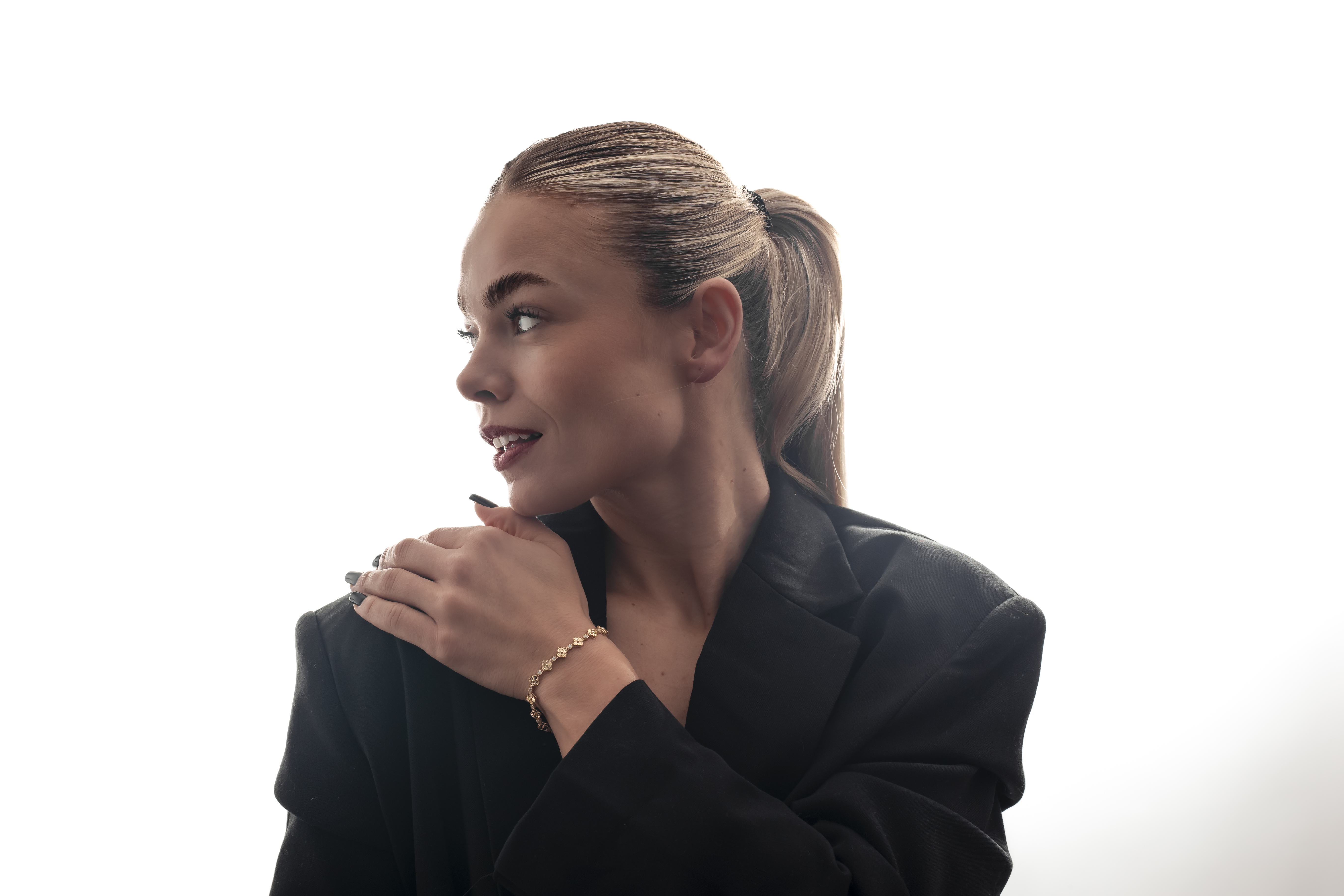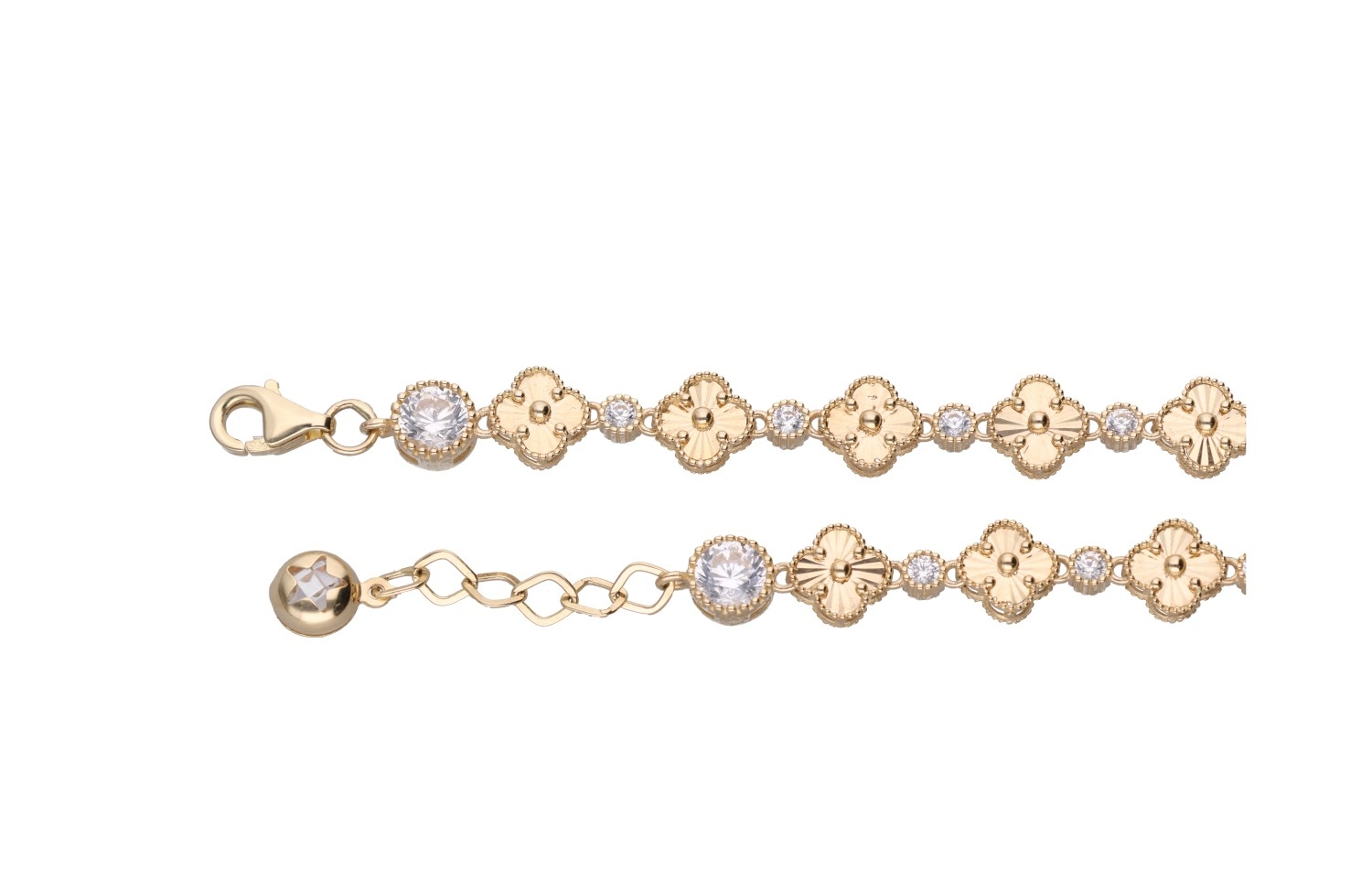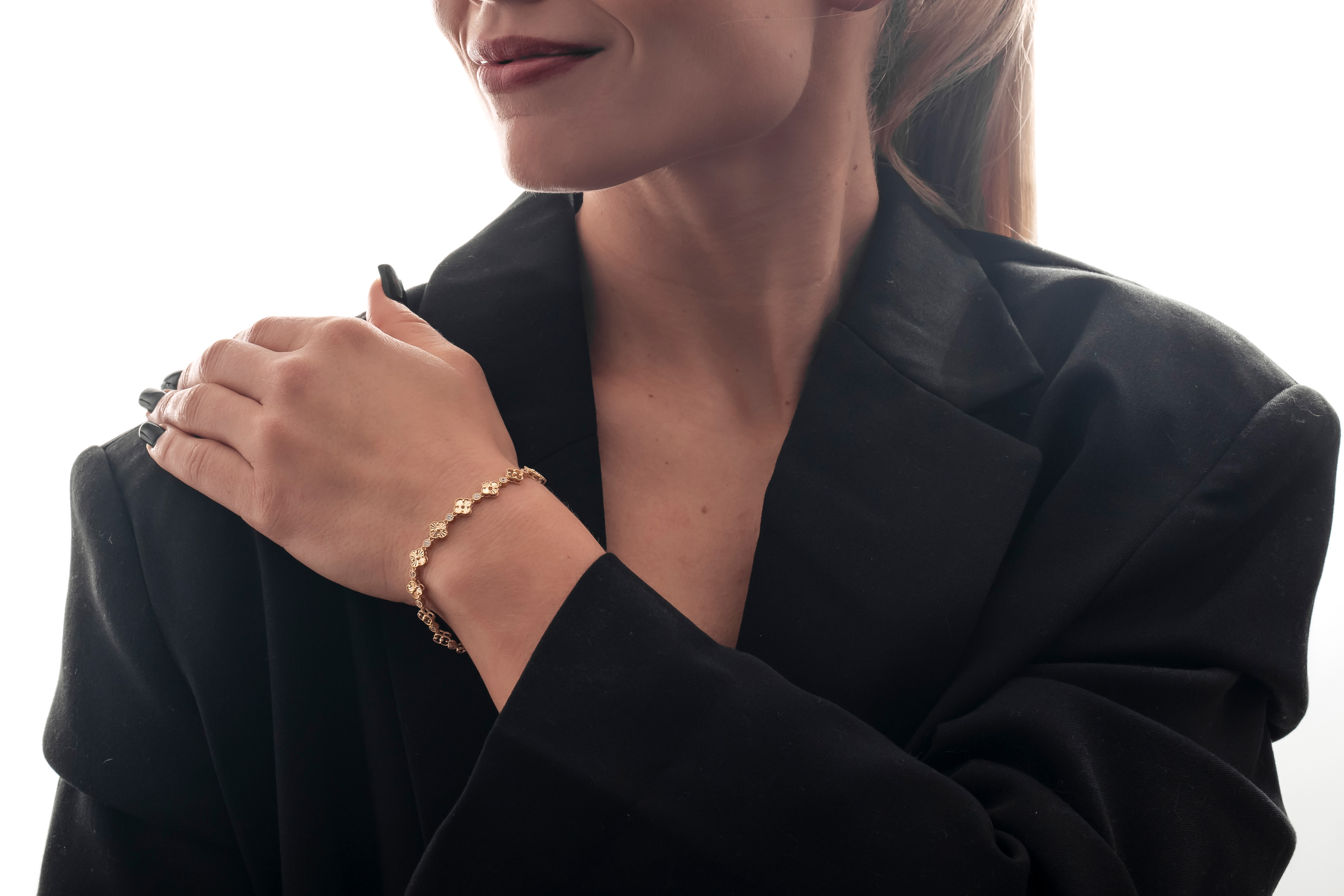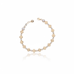 Bransoletka Glover przyciąga uwagę eleganckim motywem inspirowanym kształtem koniczyny, który nadaje biżuterii wyjątkowej lekkości i harmonii. Złote elementy zostały połączone z subtelnie połyskującymi kamieniami, dzięki czemu całość pięknie odbija światło przy każdym ruchu dłoni. Precyzyjne zdobienia oraz rytmiczne ułożenie detali tworzą kompozycję pełną elegancji i delikatnego blasku. To biżuteria, która dodaje stylizacji charakteru i podkreśla kobiecy styl. Glover świetnie prezentuje się zarówno solo, jak i w zestawieniu z innymi złotymi bransoletkami.