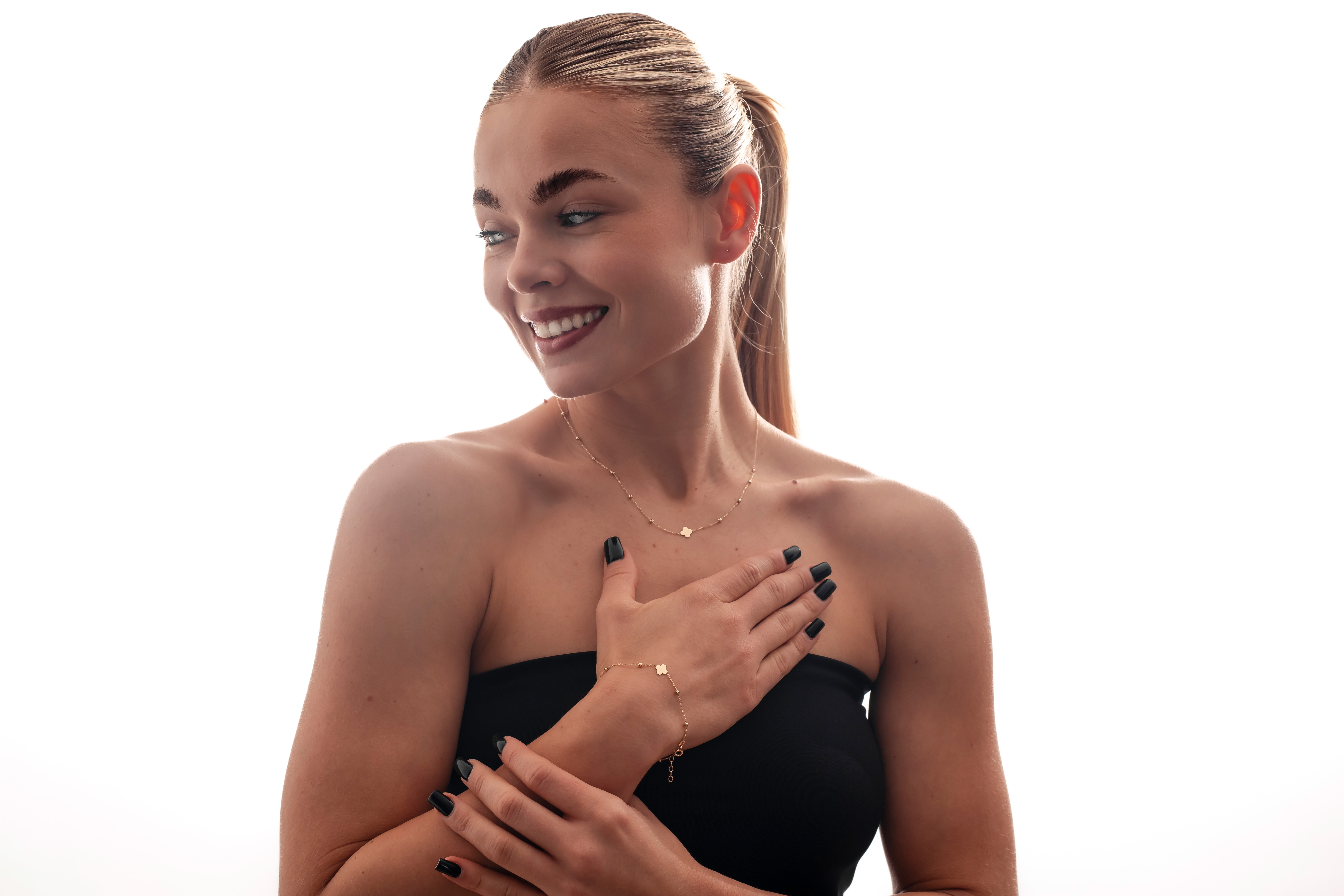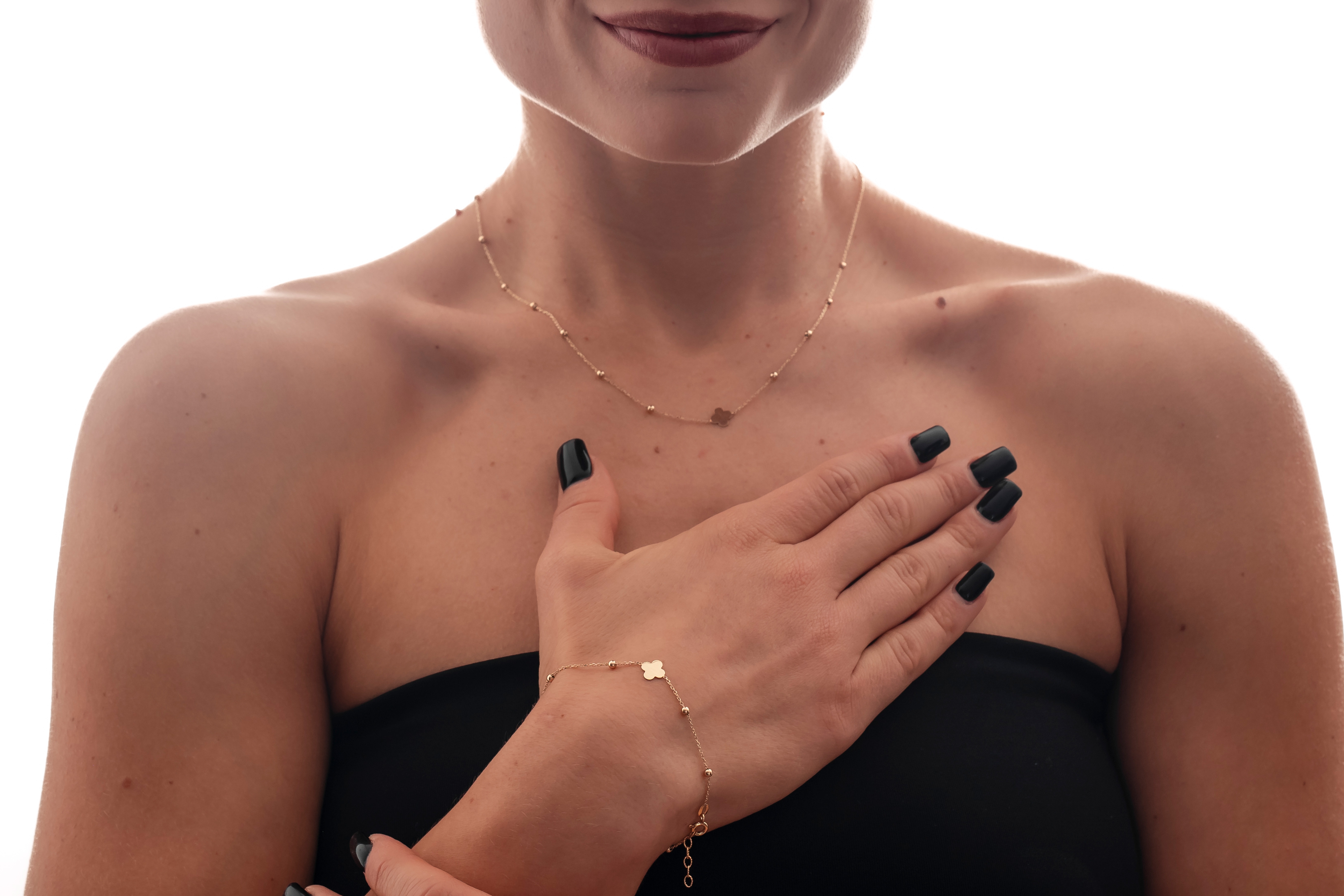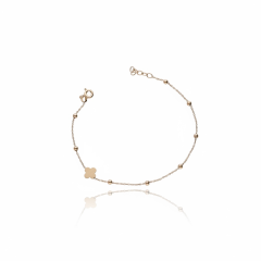 Bransoletka Ornella zachwyca subtelną formą i lekką, niemal eteryczną kompozycją. Delikatna konstrukcja ozdobiona drobnymi kulkami oraz centralnym motywem koniczyny tworzy harmonijną całość o wyjątkowym uroku. Minimalistyczny design sprawia, że biżuteria pięknie układa się na nadgarstku i przyciąga uwagę swoją finezją. To model, który dodaje stylizacji lekkości i elegancji bez nadmiaru. Ornella idealnie wpisuje się w nowoczesne, kobiece trendy.