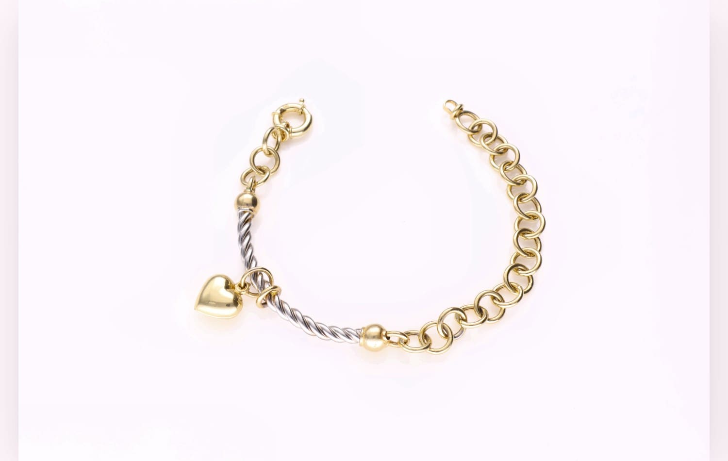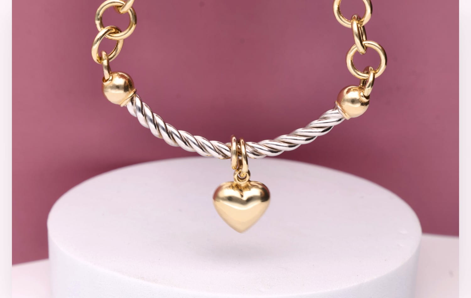 Bransoletka Unity łączy w sobie subtelność złota z nowoczesnym akcentem w postaci srebrnych elementów, tworząc harmonijną całość. Delikatne ogniwa łańcuszka przeplatają się z eleganckim, spiralnym zdobieniem, które nadaje bransoletce wyrafinowanego charakteru. Urokliwy wisiorek w kształcie serca, wykonany z połyskującego złota, podkreśla jej romantyczny wymiar.
