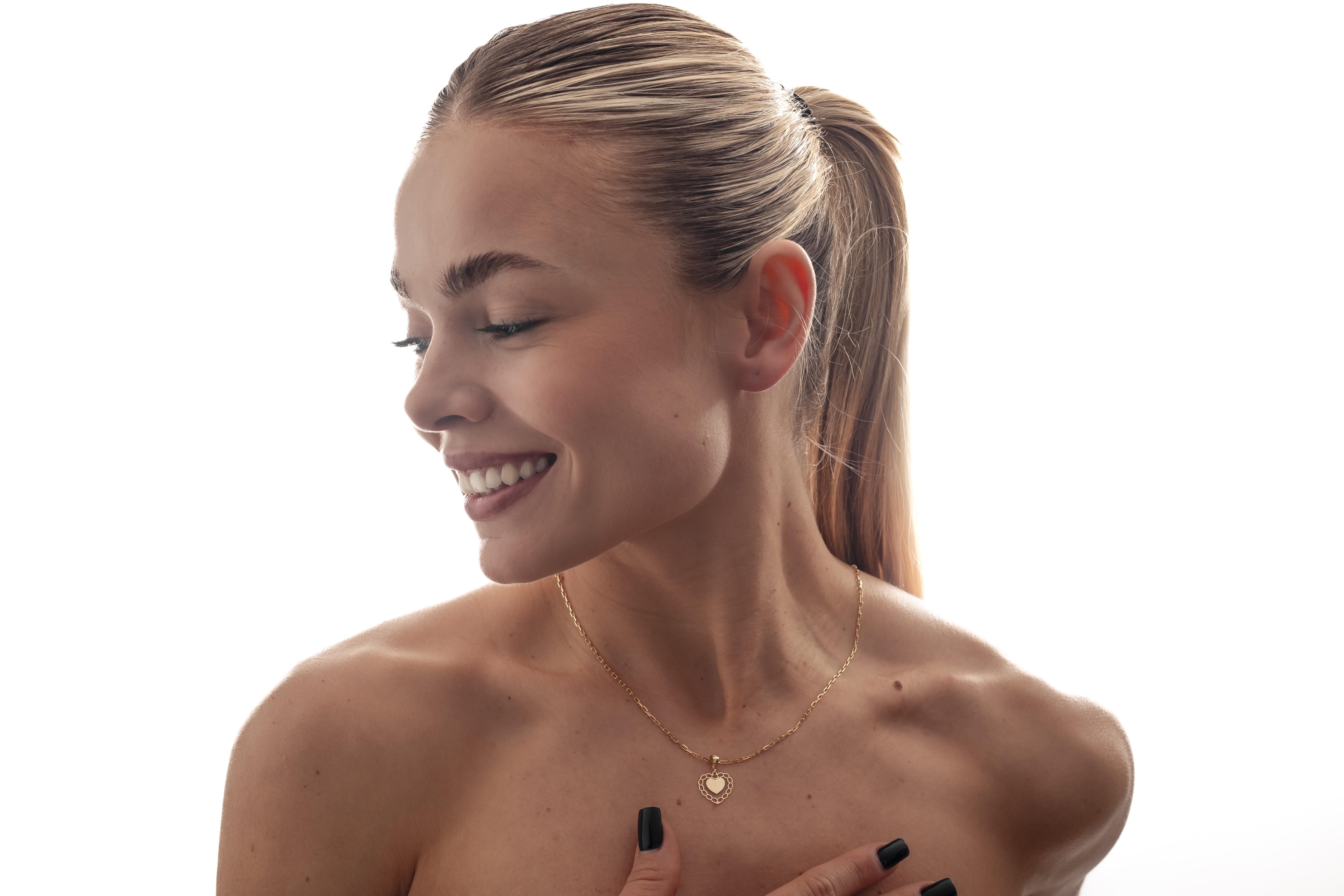 Złota zawieszka Corena przyciąga uwagę eleganckim motywem serca w nowoczesnym, ażurowym wydaniu. Centralny, ciemniejszy element pięknie kontrastuje ze złotą oprawą, nadając biżuterii głębi i wyrazistości. To złota zawieszka 375, która łączy romantyczny charakter z nowoczesnym designem. Delikatne zdobienia wokół serca tworzą efekt lekkości i subtelnego blasku. Doskonale prezentuje się na łańcuszku jako wyjątkowy, przyciągający spojrzenia detal. Idealna dla kobiet, które lubią biżuterię z nutą emocji, ale w eleganckim wydaniu. Corena to złota biżuteria, która podkreśla styl i kobiecą wrażliwość.
