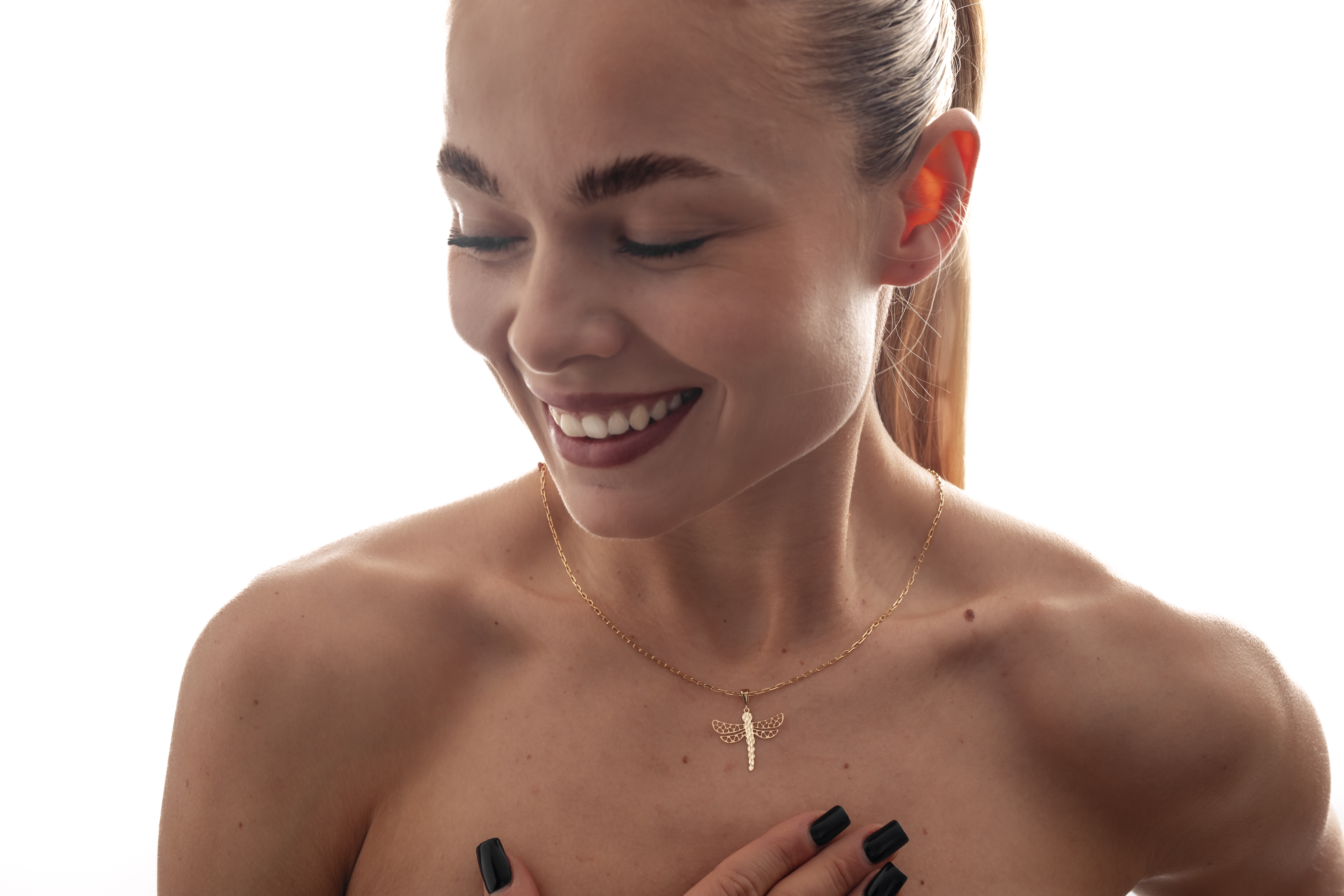Zawieszka Lyra zachwyca delikatną formą inspirowaną naturą i lekkością ruchu. Subtelne skrzydła zdobione drobnymi kamieniami tworzą efekt migotania przy każdym poruszeniu, przyciągając spojrzenia. Smukła sylwetka i precyzyjne detale nadają jej wyjątkowej elegancji i finezji. To biżuteria, która łączy w sobie subtelność z wyrazistym charakterem. Lyra pięknie dopełnia stylizacje, dodając im lekkości i blasku.