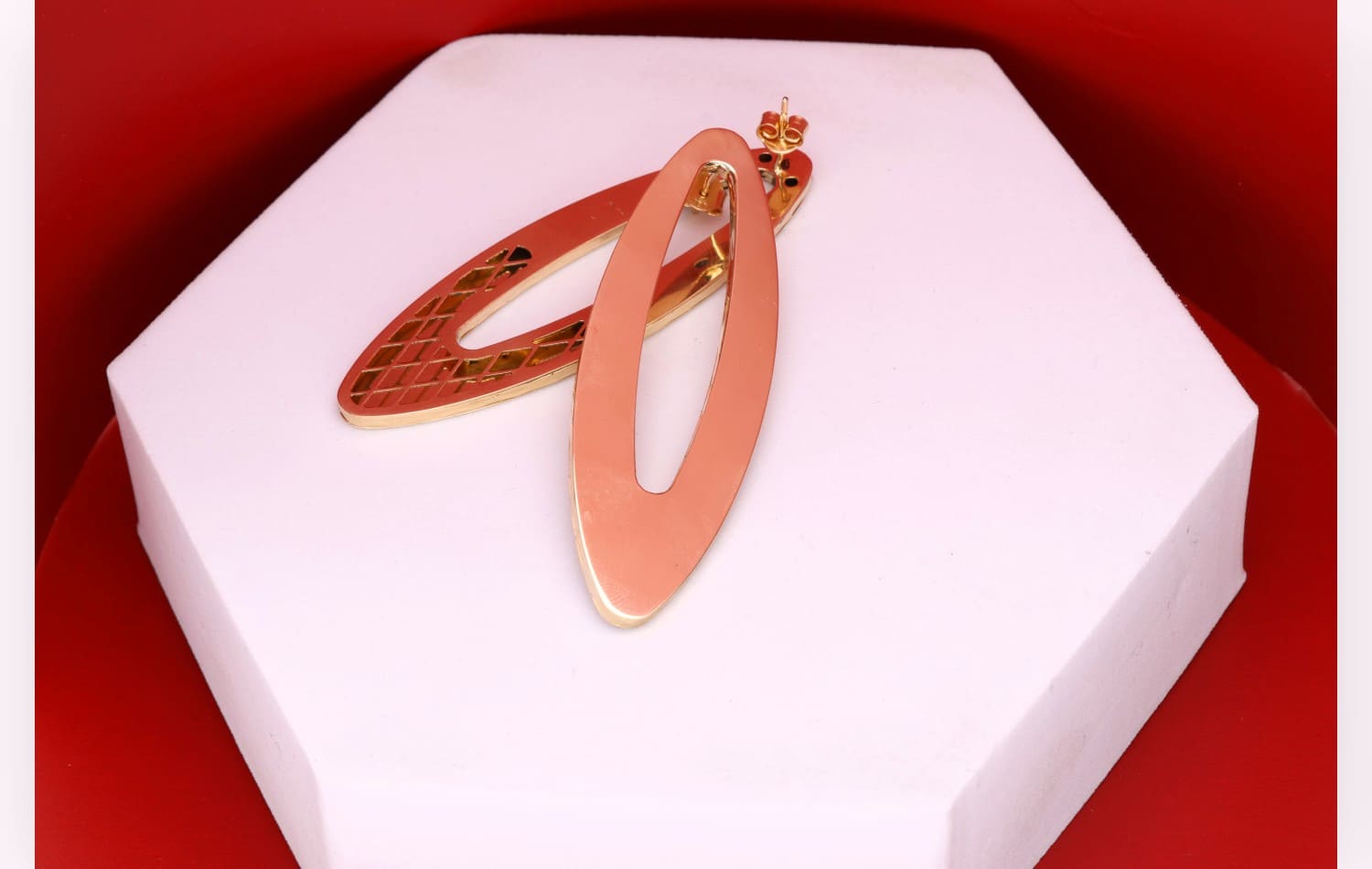 Kolczyki Frame zachwycają ultranowoczesną, wydłużoną formą z charakterystycznym wycięciem tworzącym przestrzenny kontur. Ich czysta, geometryczna linia nadaje całości wyrazisty, modowy charakter w duchu współczesnego minimalizmu. Smukłe proporcje pięknie wysmuklają szyję i przyciągają spojrzenia subtelną grą światła na gładkiej powierzchni złota. To model, który nie potrzebuje dodatkowych zdobień – siłą jest tu forma i świadomy projekt. Frame definiują styl jednym, mocnym akcentem. To propozycja dla kobiet, które cenią odważną prostotę w luksusowym wydaniu.