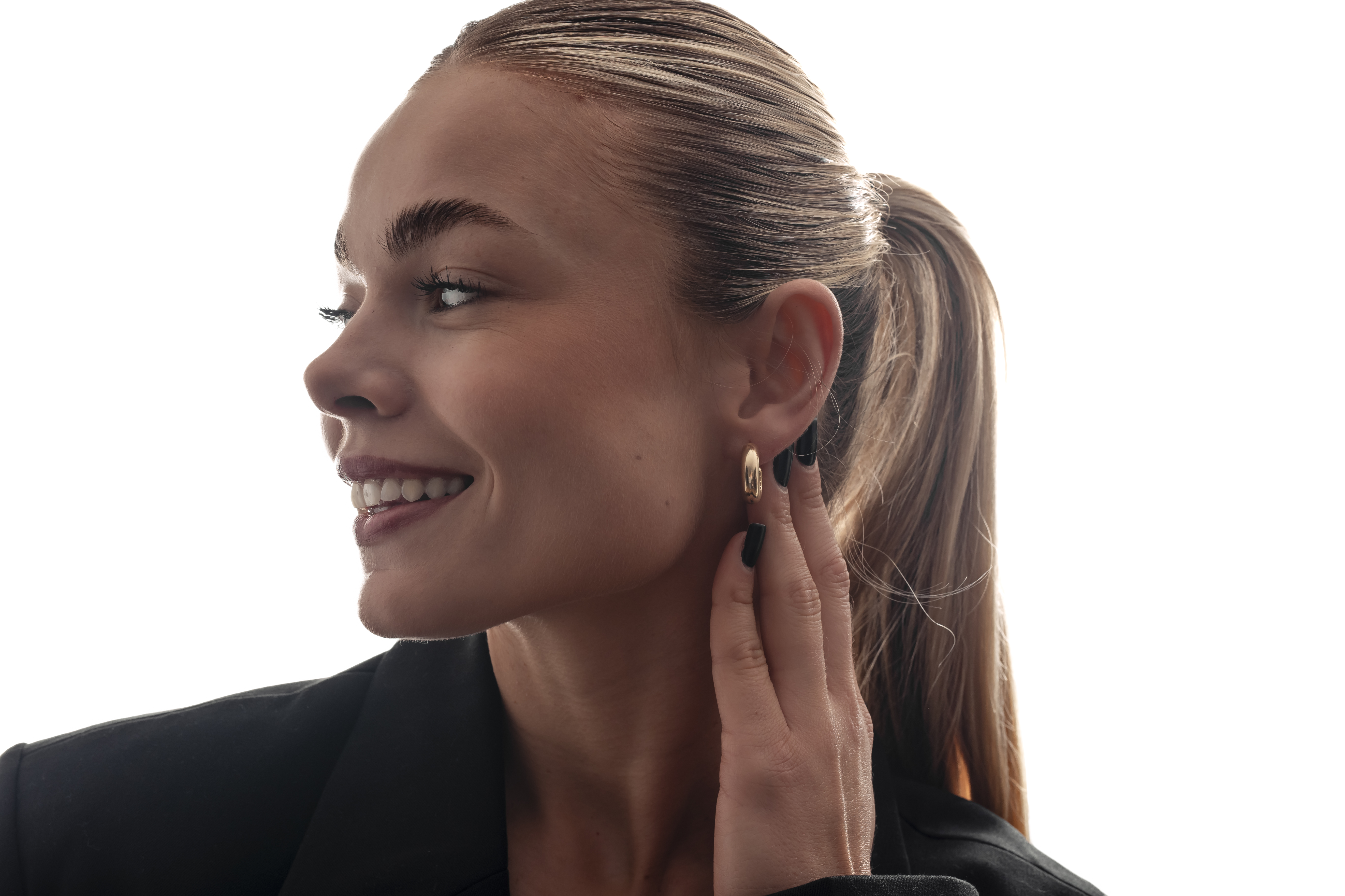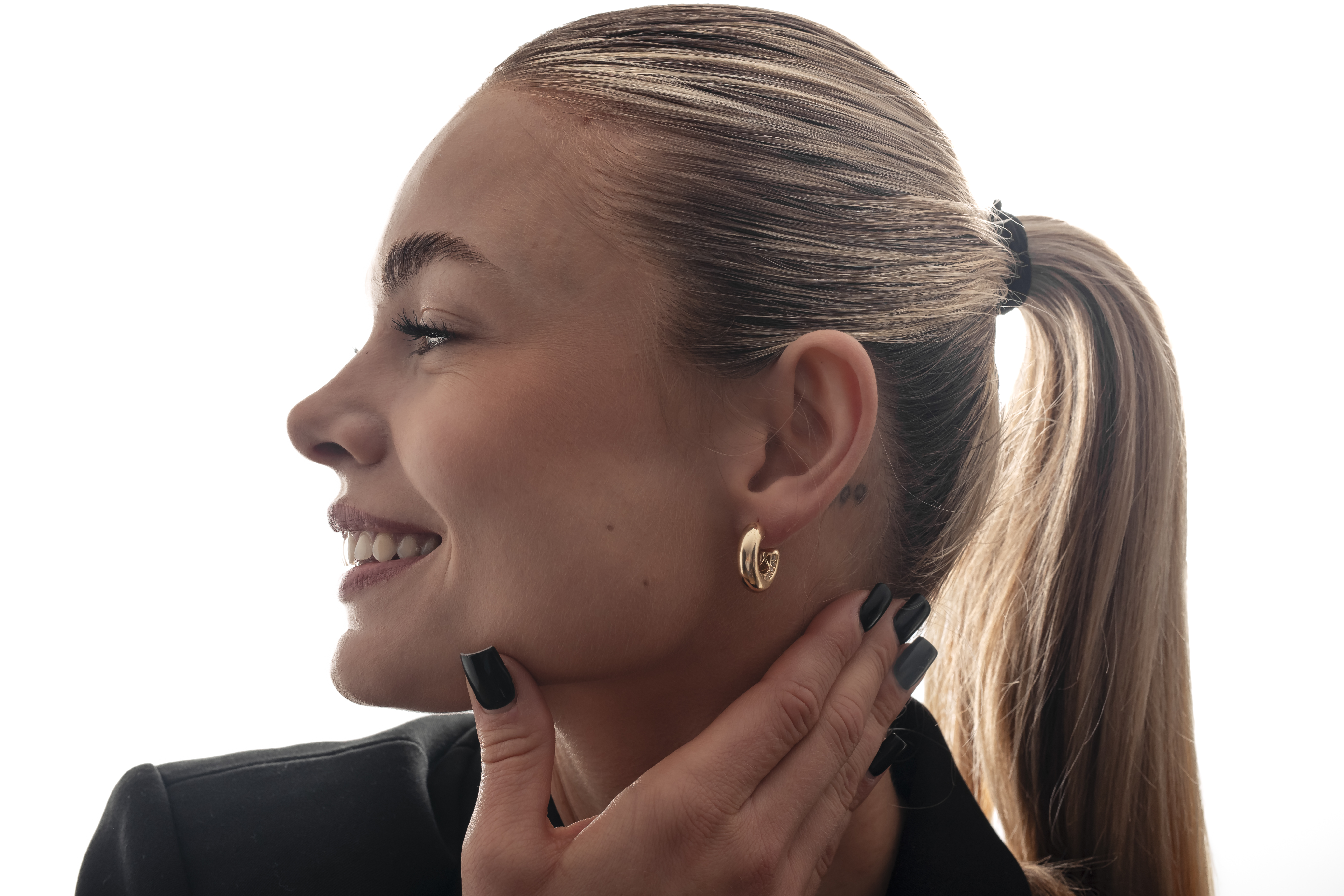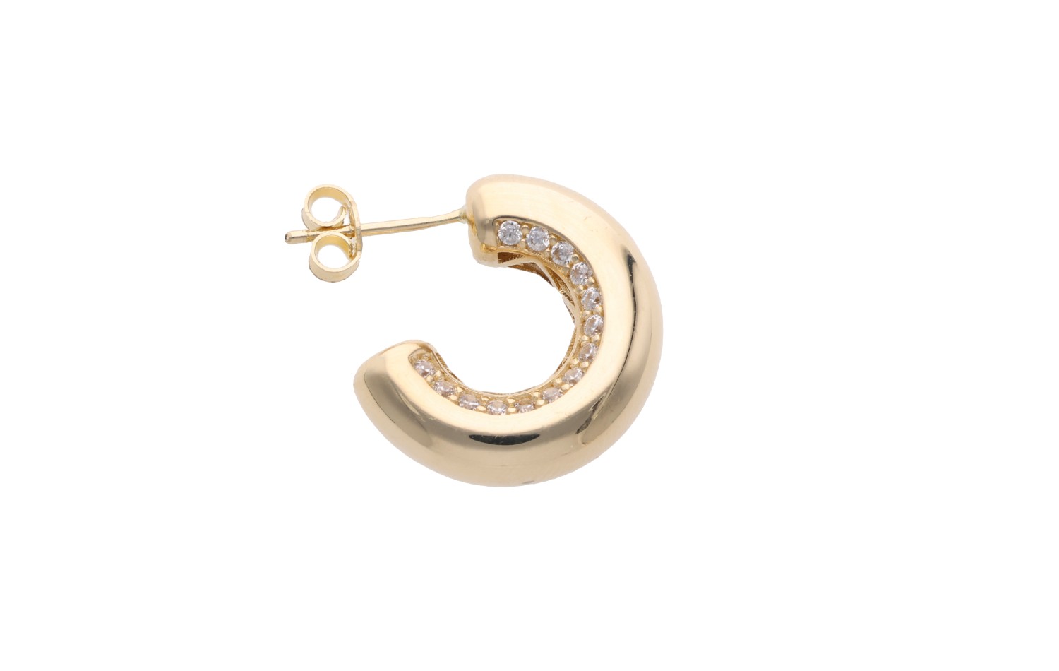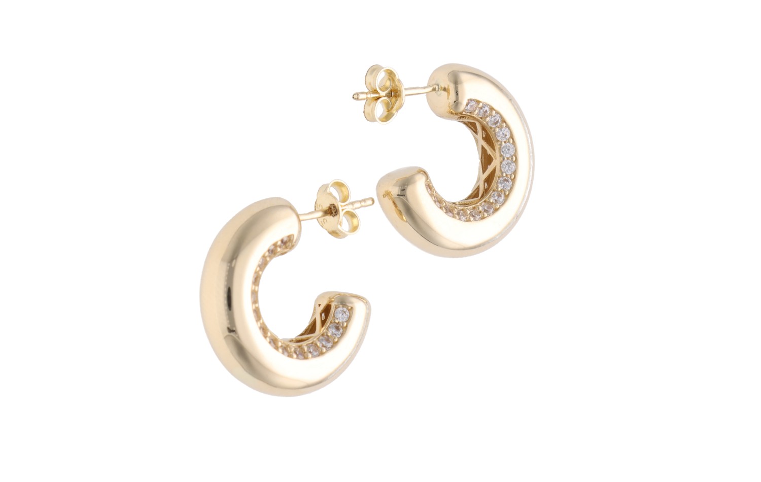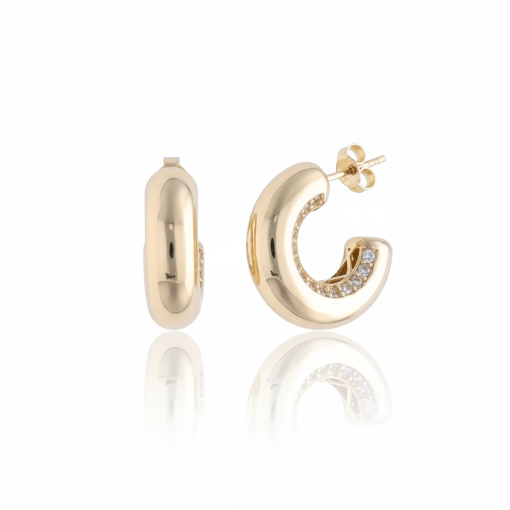 Kolczyki Khloe zachwycają nowoczesną, masywniejszą formą w kształcie otwartego półokręgu, która nadaje im wyrazisty i stylowy charakter. Wewnętrzna linia została subtelnie ozdobiona lśniącymi kamieniami, które pięknie kontrastują z gładką, złotą powierzchnią. Ich zaokrąglony kształt sprawia, że kolczyki doskonale układają się na uchu i przyciągają spojrzenia eleganckim blaskiem. To model, który łączy minimalistyczną formę z wyrazistym designem. Khloe idealnie podkreślą styl i dodadzą charakteru każdej stylizacji.