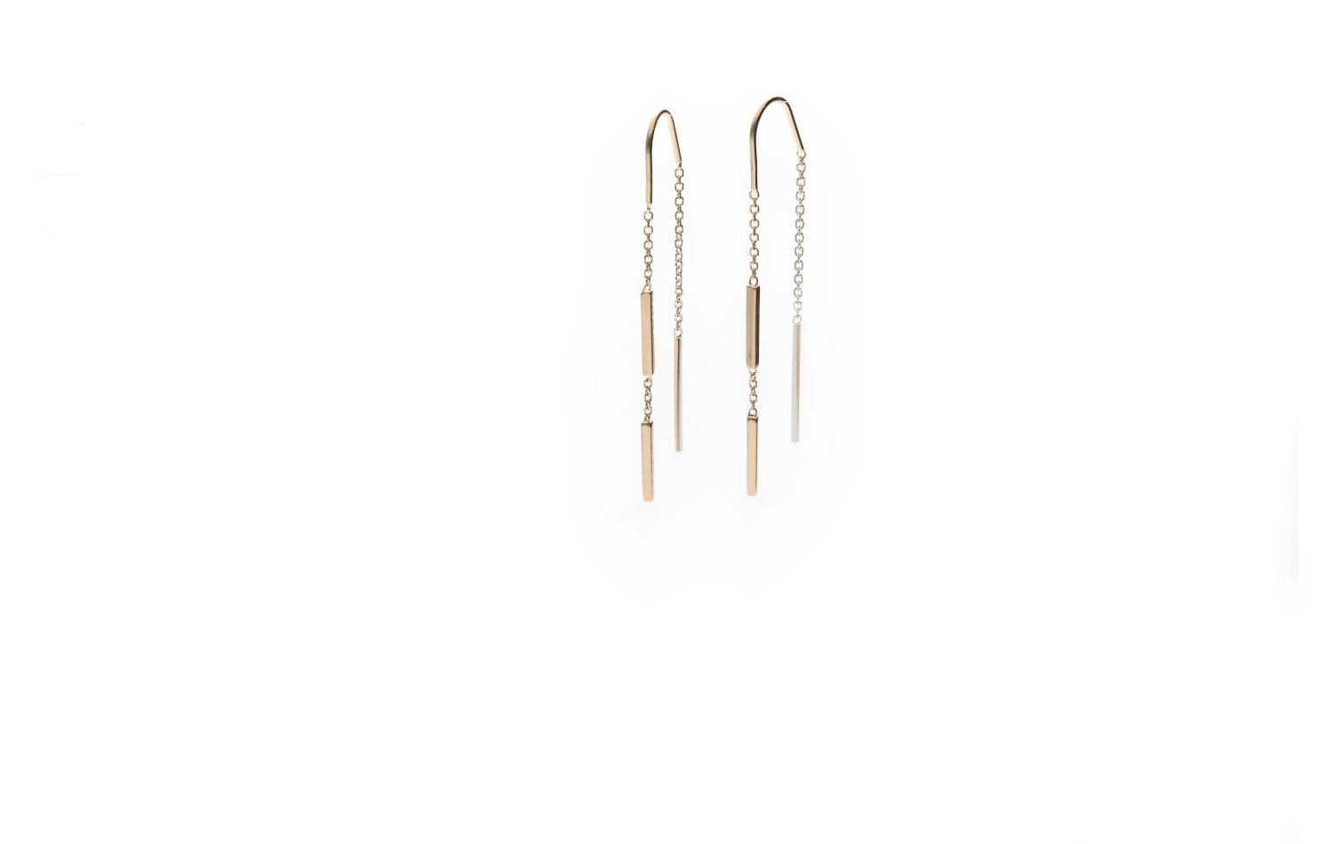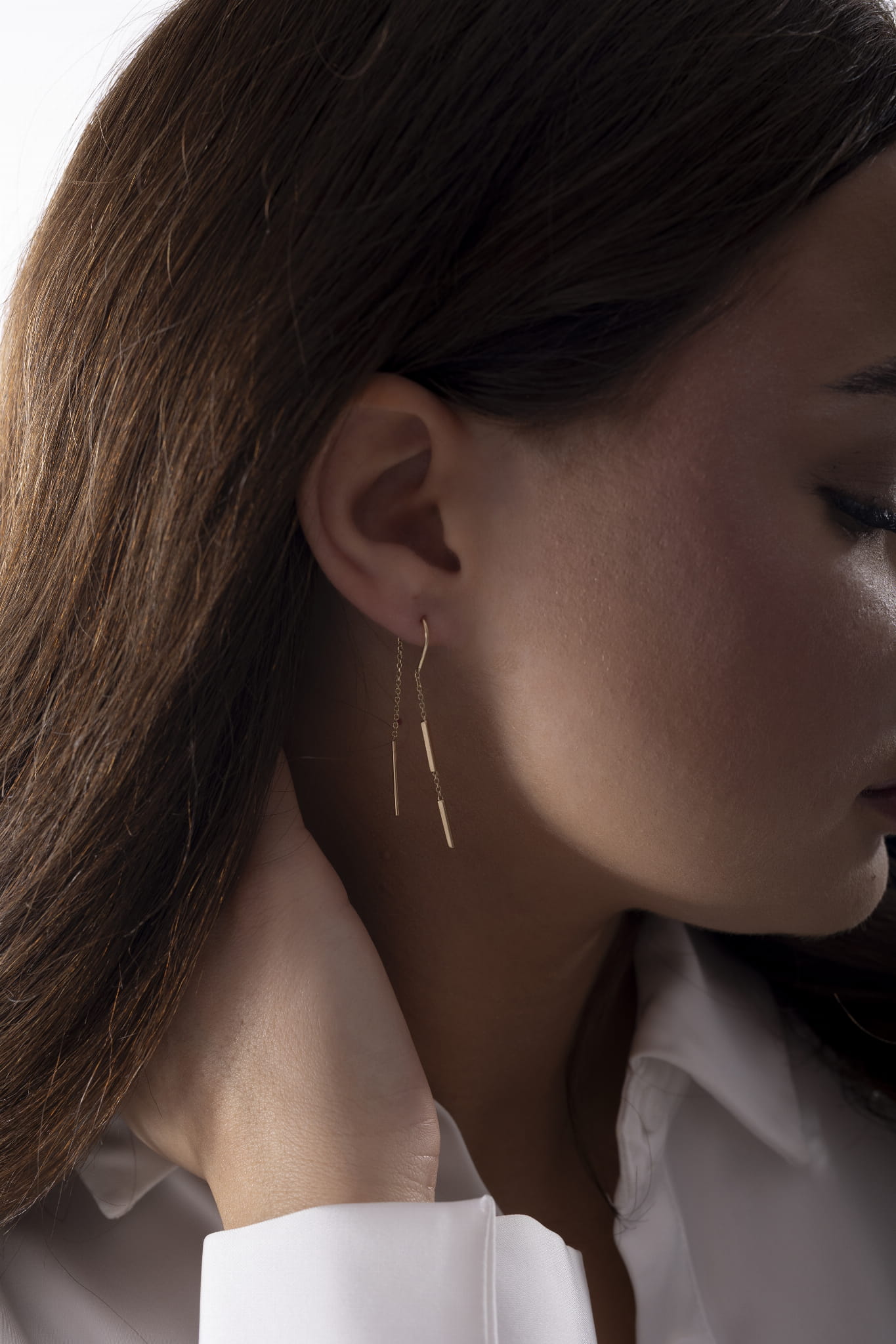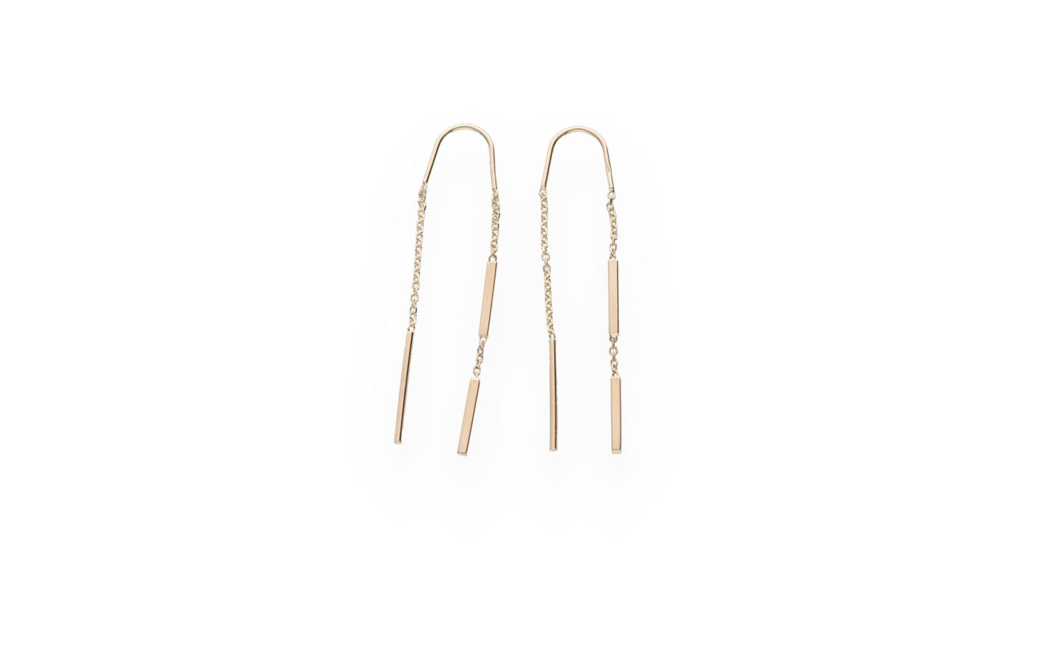 Kolczyki przesuwane przez ucho wykonane z litego złota próby 585 (14 karatów). Konstrukcja opiera się na cienkim, liniowym elemencie połączonym z delikatnym łańcuszkiem. Forma jest lekka i wydłużona, zaprojektowana do swobodnego przeciągania przez ucho. Brak klasycznego zapięcia podkreśla prostotę konstrukcji. Polerowana powierzchnia nadaje całości jednolity połysk. Model zachowuje minimalistyczny charakter i czystą geometrię.