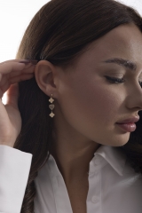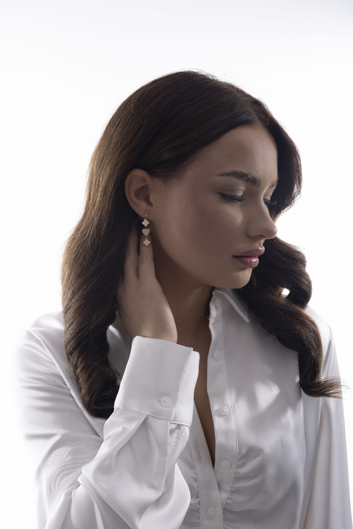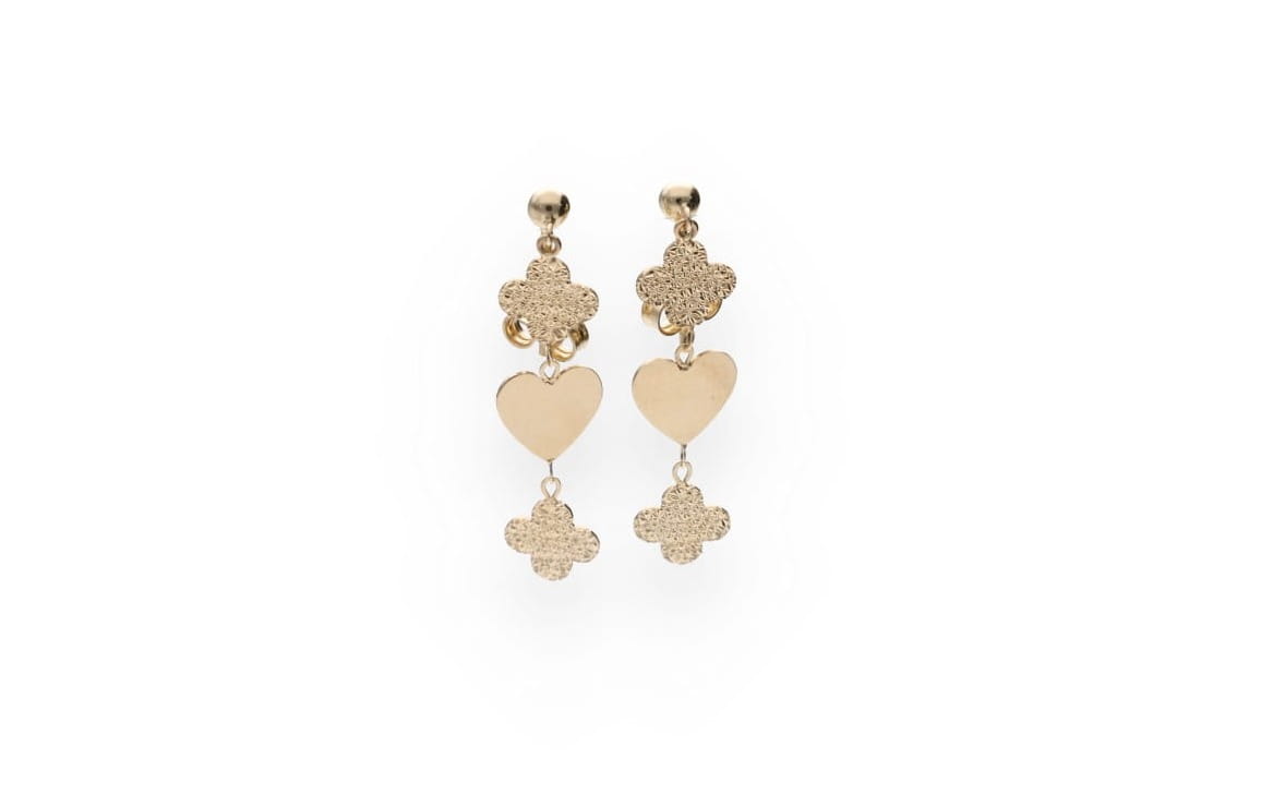 Kolczyki wiszące z litego złota próby 585 (14 karatów). Konstrukcja oparta jest na połączonych, drobnych elementach o zróżnicowanej fakturze. Centralną część stanowi gładki detal w kształcie serca, zestawiony z teksturowanymi formami po bokach. Proporcje są wydłużone, ale lekkie wizualnie. Zapięcie na sztyft zapewnia stabilne osadzenie kolczyków. Całość zachowuje uporządkowaną, modułową formę.