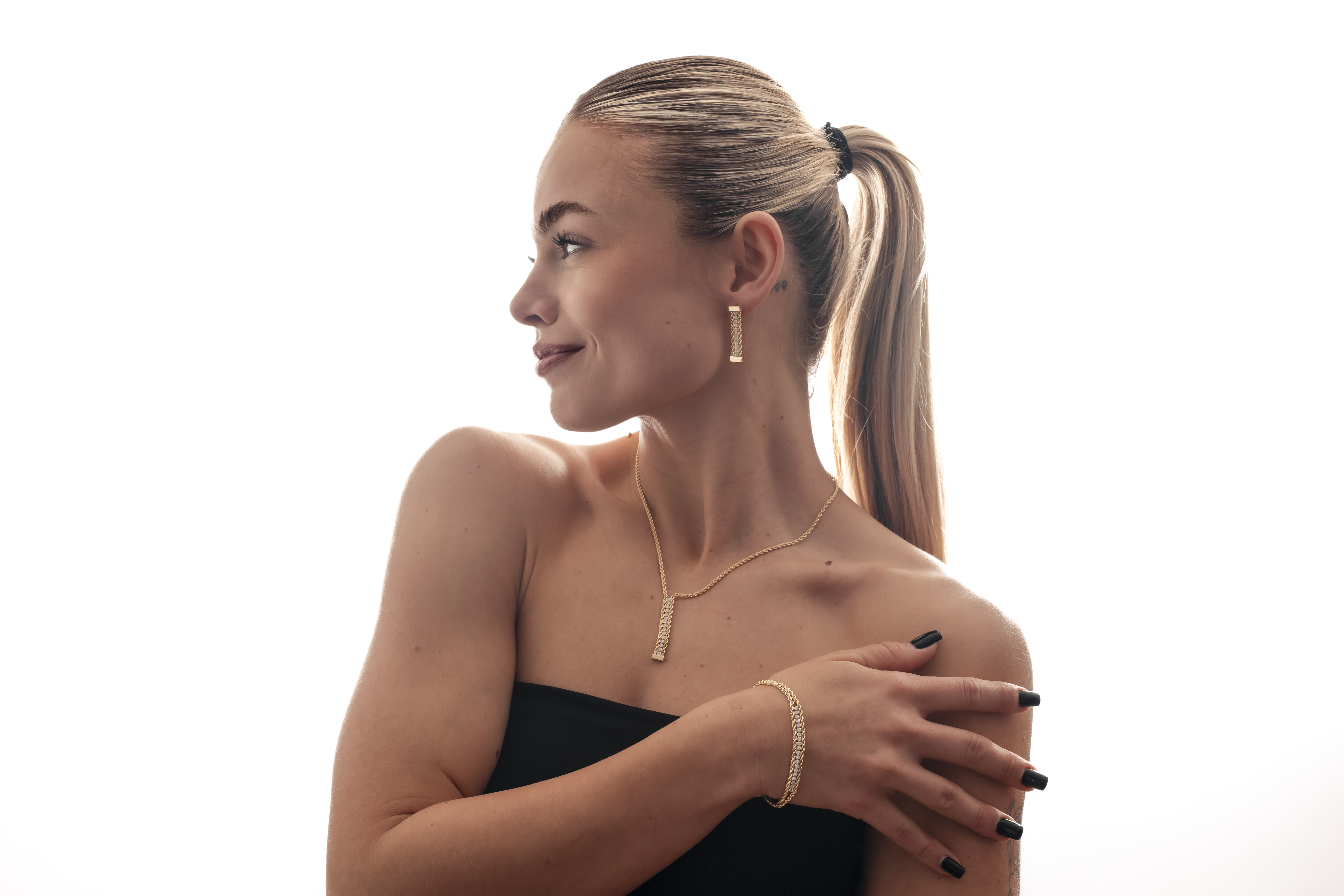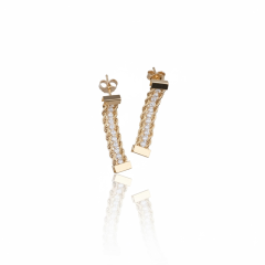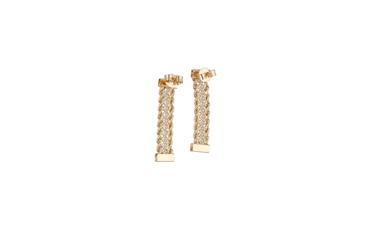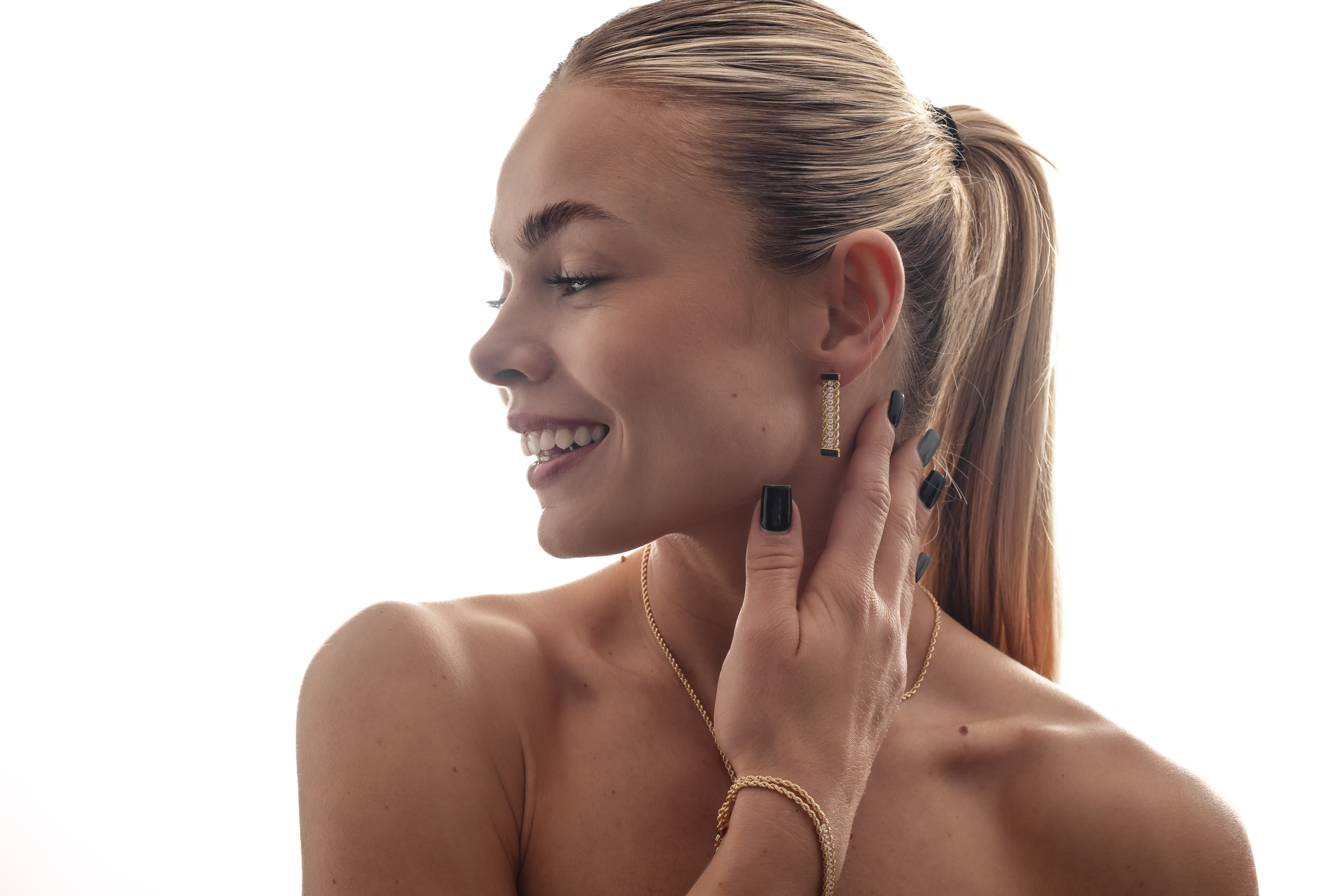 Kolczyki Liora wyróżniają się efektowną, wydłużoną formą, która pięknie podkreśla linię szyi i dodaje stylizacji elegancji. Centralny rząd lśniących kamieni przyciąga światło, tworząc wyrazisty, luksusowy efekt. Plecione, złote detale po bokach nadają całości głębi i charakteru, tworząc unikalne połączenie klasyki z nowoczesnym designem. Geometryczne wykończenia dodają kolczykom wyrazistości i sprawiają, że są wyjątkowym akcentem biżuteryjnym. Liora to model dla osób, które lubią mocniejsze, eleganckie dodatki.