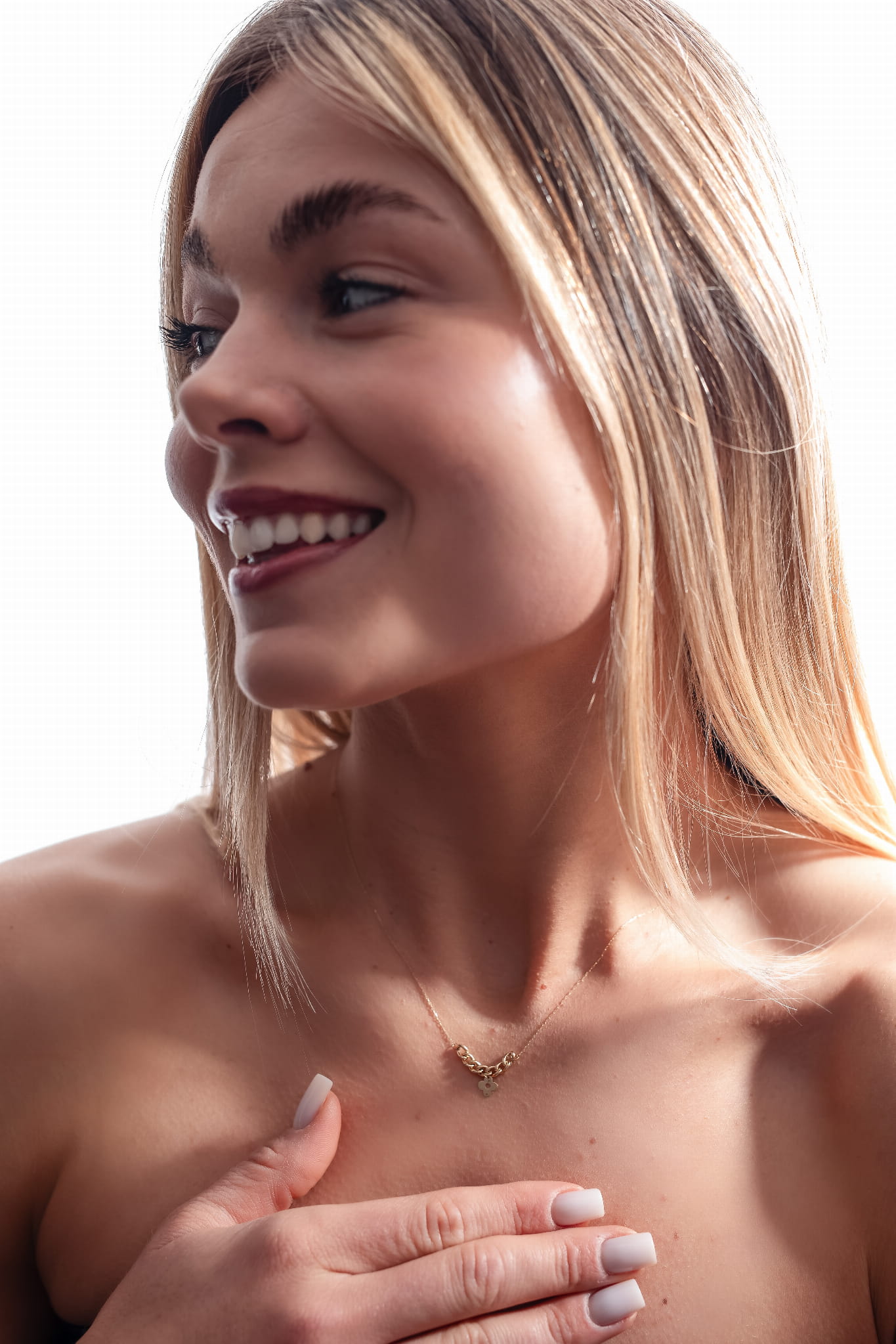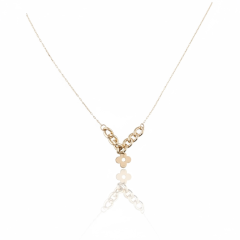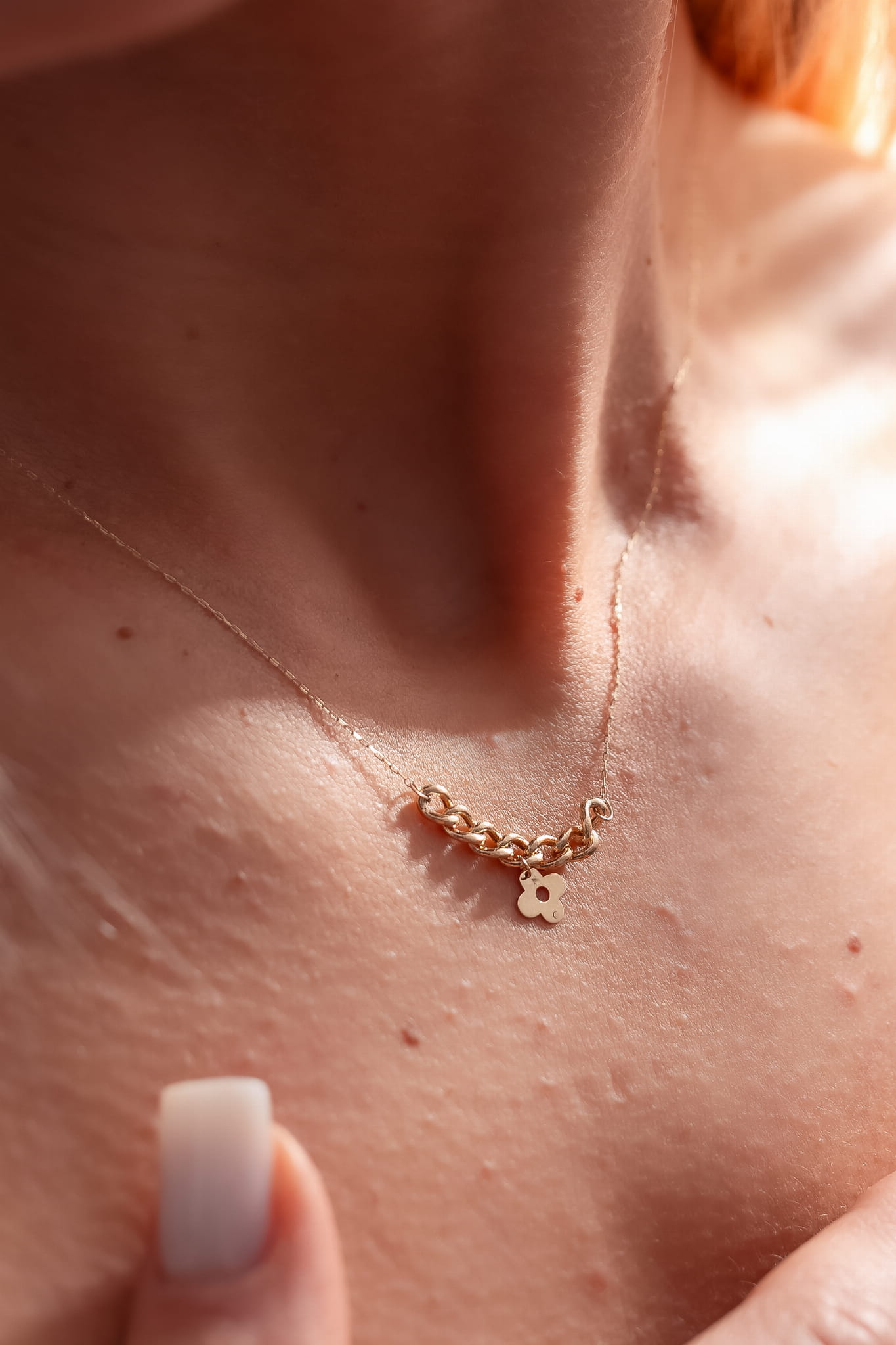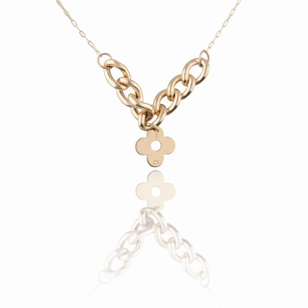 Subtelny naszyjnik o wyjątkowym charakterze, który przyciąga uwagę delikatnym łańcuszkiem i ozdobnym elementem o wyrazistym splocie. Centralny motyw nadaje całości nowoczesnej elegancji, zachowując jednocześnie lekkość i minimalizm formy. To biżuteria dla osób ceniących detale oraz ponadczasowe wzornictwo inspirowane włoskim stylem. Doskonale podkreśla linię dekoltu i stanowi elegancki akcent każdej stylizacji. Precyzyjne wykonanie oraz szlachetny blask złota sprawiają, że naszyjnik zachwyca swoją jakością i estetyką.