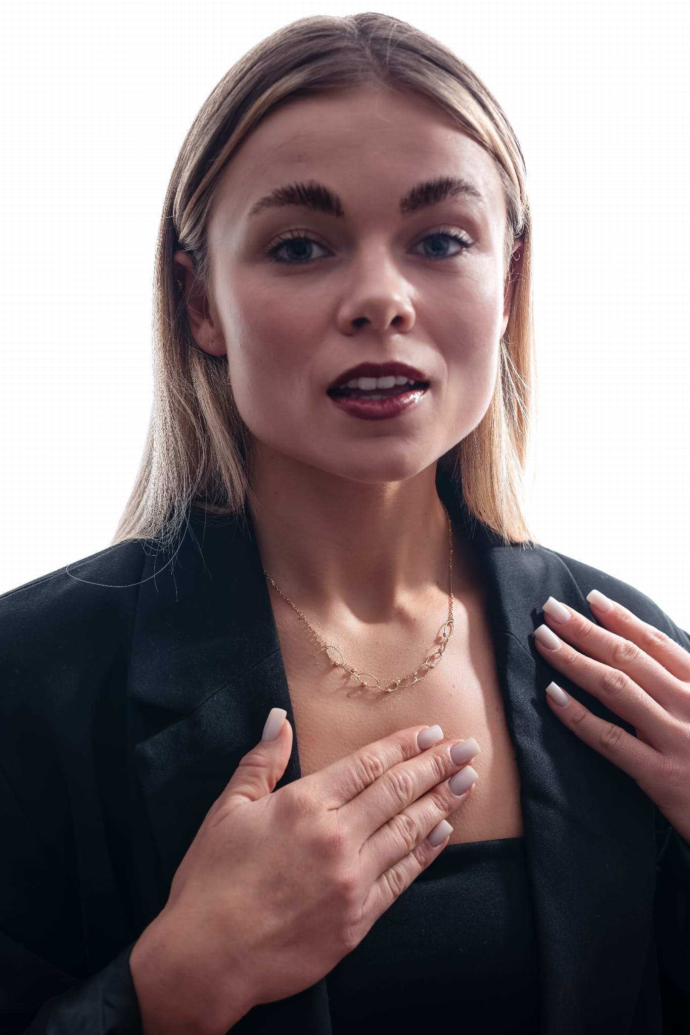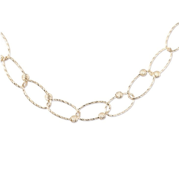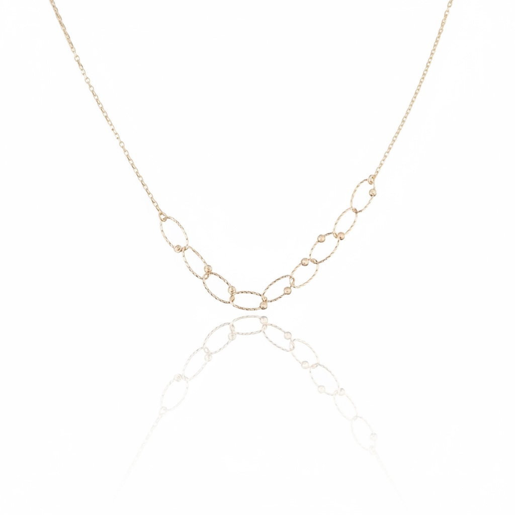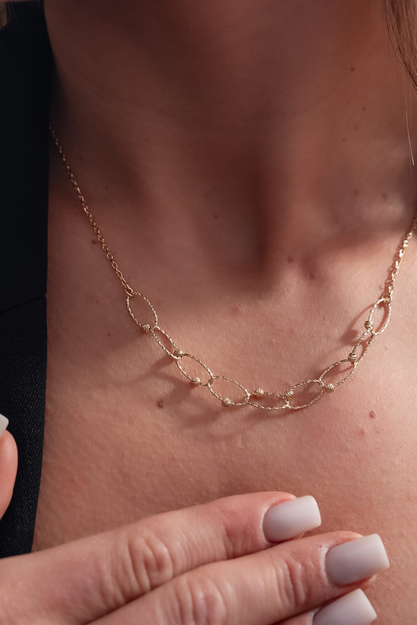 Wyjątkowy naszyjnik o eleganckiej formie, wyróżniający się dekoracyjnym elementem z połączonych ogniw o subtelnej fakturze. Ozdobny splot nadaje biżuterii nowoczesnego charakteru, jednocześnie zachowując jej lekkość i ponadczasową estetykę. Delikatny łańcuszek harmonijnie współgra z centralnym motywem, pięknie podkreślając linię dekoltu. To stylowa propozycja dla osób ceniących wyraziste detale oraz włoskie wzornictwo jubilerskie. Starannie wykonany naszyjnik zachwyca precyzją i szlachetnym blaskiem złota.
