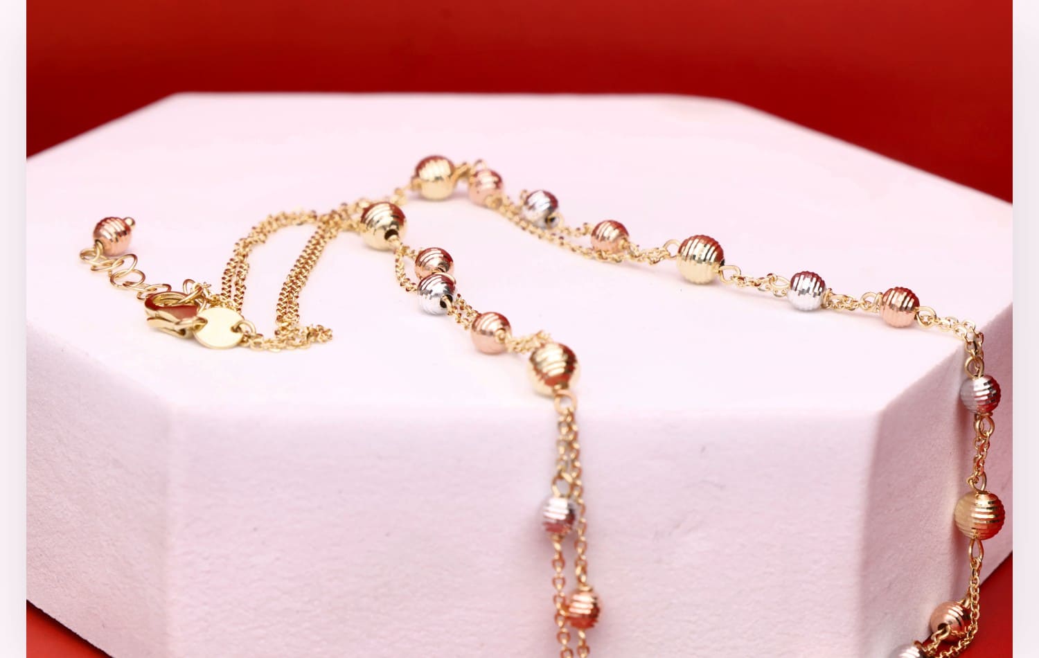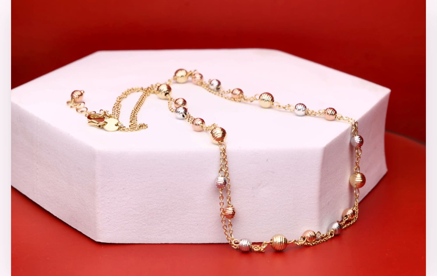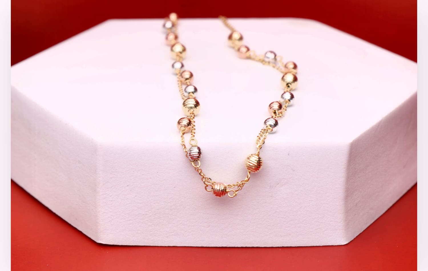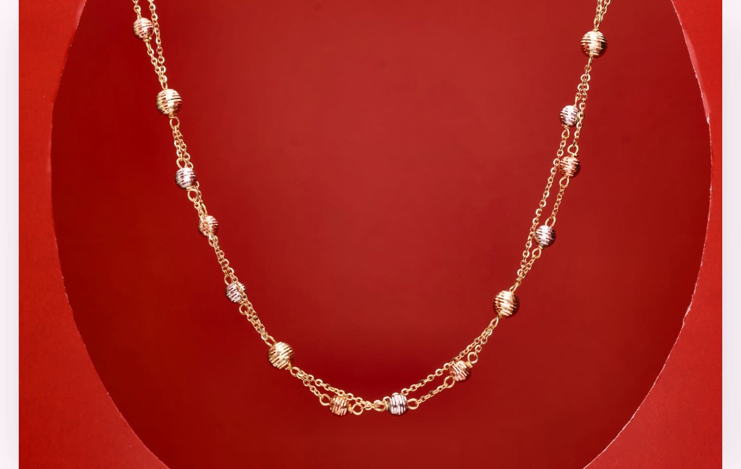 Cosmo to naszyjnik wykonany ze złota 14k próby 585, składający się z delikatnego łańcuszka ozdobionego rytmicznie rozmieszczonymi, trójkolorowymi, karbowanymi kulkami. Złoto żółte, białe i różowe tworzy subtelne przejścia kolorystyczne, które pięknie łapią światło przy każdym ruchu.