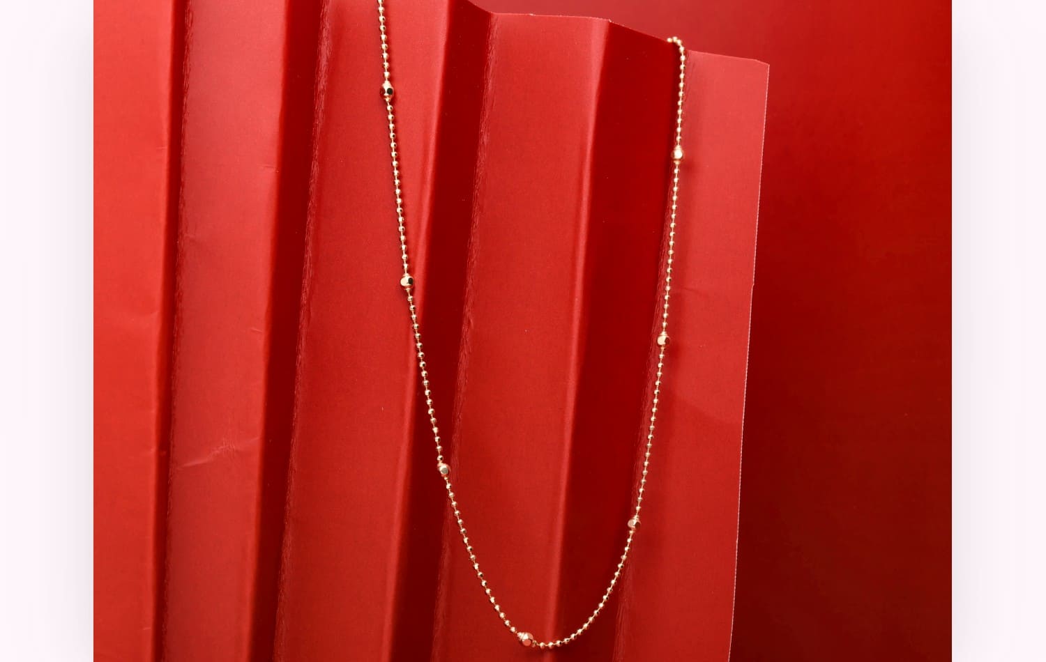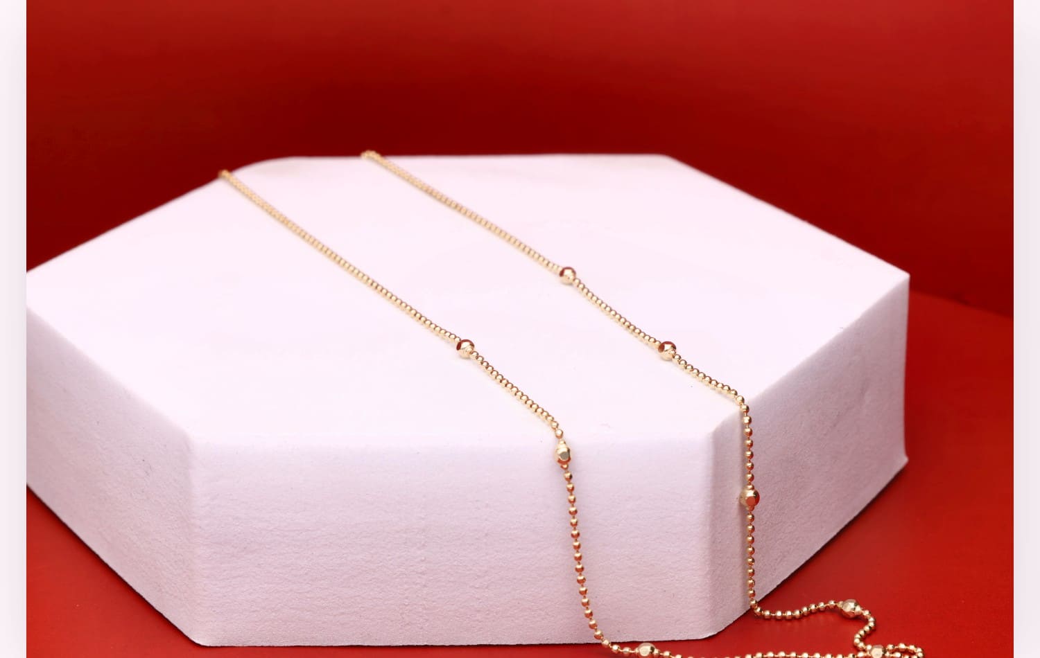 Delight to delikatny naszyjnik wykonany ze złota 14k próby 585, oparty na drobnym, kulkowym splocie, uzupełnionym subtelnymi, większymi złotymi koralikami rozmieszczonymi w równych odstępach. Ten model daje efekt lekkości, harmonii i minimalistycznej elegancji – idealny dla kobiet, które uwielbiają biżuterię będącą subtelnym dodatkiem do stylu.