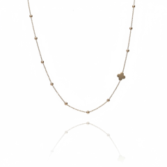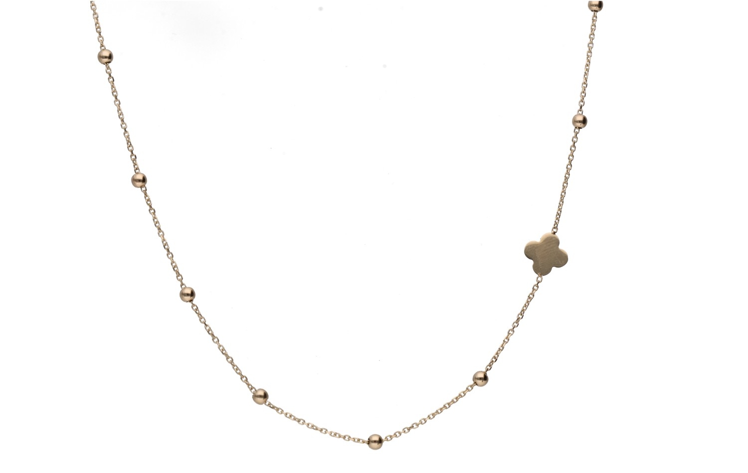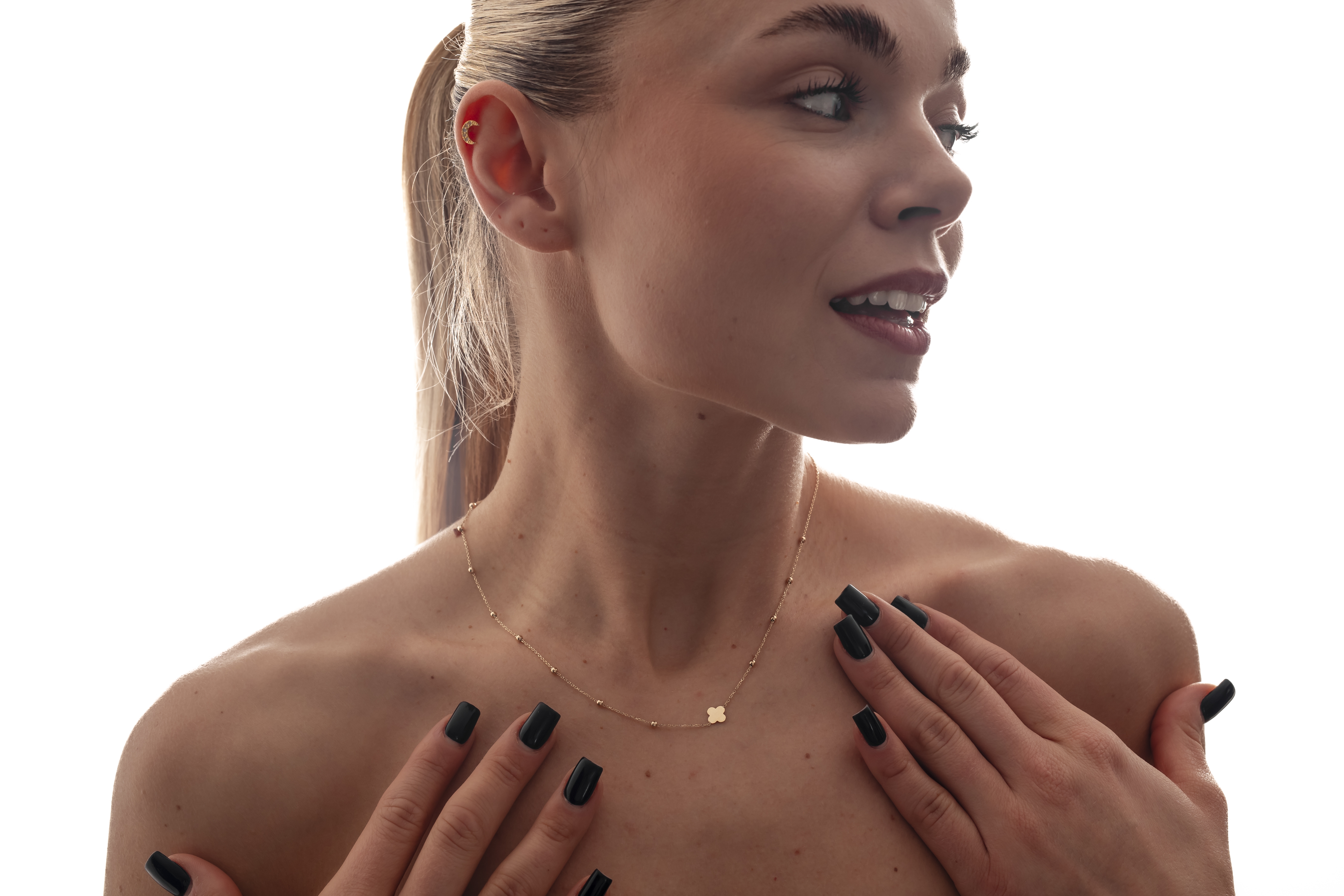 Naszyjnik Ornella stanowi idealne dopełnienie bransoletki z tej samej kolekcji, tworząc spójny i elegancki zestaw. Delikatny łańcuszek ozdobiony drobnymi kulkami oraz subtelnym motywem koniczyny nadaje całości lekkości i harmonii. Minimalistyczna forma pięknie układa się na dekolcie, podkreślając kobiecy styl bez nadmiaru. To biżuteria, która przyciąga uwagę swoją prostotą i wyrafinowaniem. Ornella doskonale wpisuje się w nowoczesne, subtelne stylizacje.