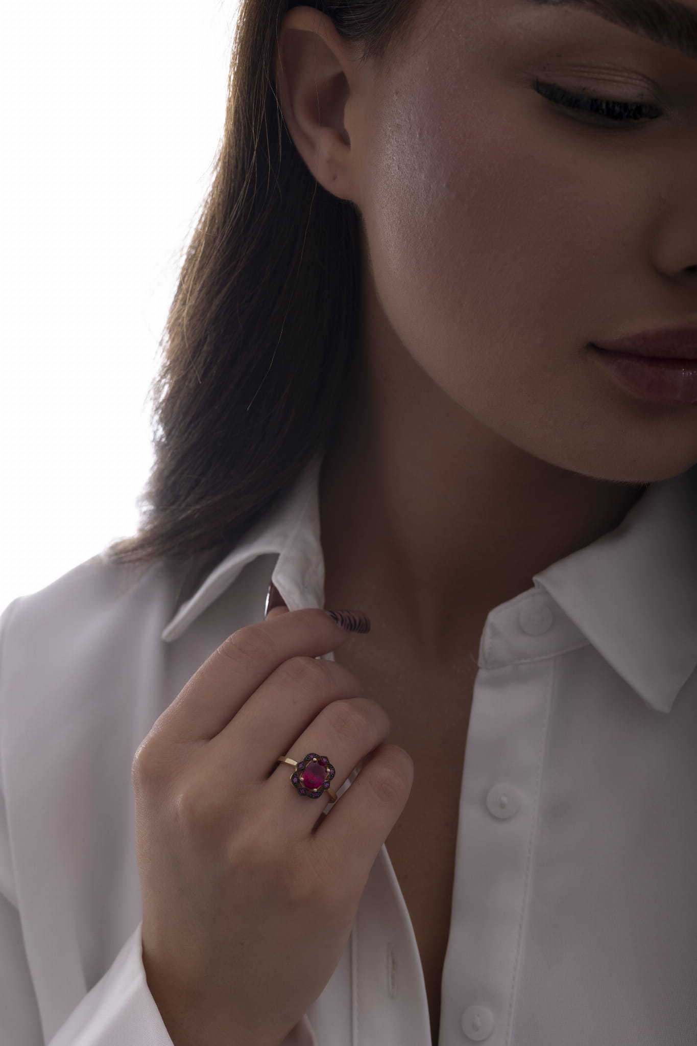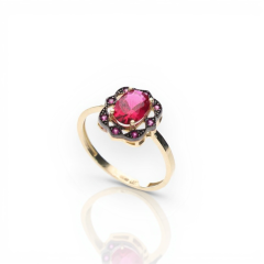 Ametrina to wyjątkowy pierścionek, który przyciąga uwagę intensywną barwą ametystu i bogatym, dekoracyjnym wykończeniem. Centralnie osadzony kamień otoczony jest drobnymi, połyskującymi detalami, które nadają całości biżuteryjnej głębi i elegancji. Wyrazista forma sprawia, że pierścionek staje się mocnym akcentem stylizacji, nie tracąc przy tym klasycznego charakteru. Złoto pięknie podkreśla kolor kamienia, tworząc harmonijne i luksusowe połączenie. To propozycja dla kobiet, które cenią biżuterię z charakterem i wyrazistym detalem. Model doskonale prezentuje się zarówno solo, jak i w zestawieniu z innymi złotymi dodatkami.