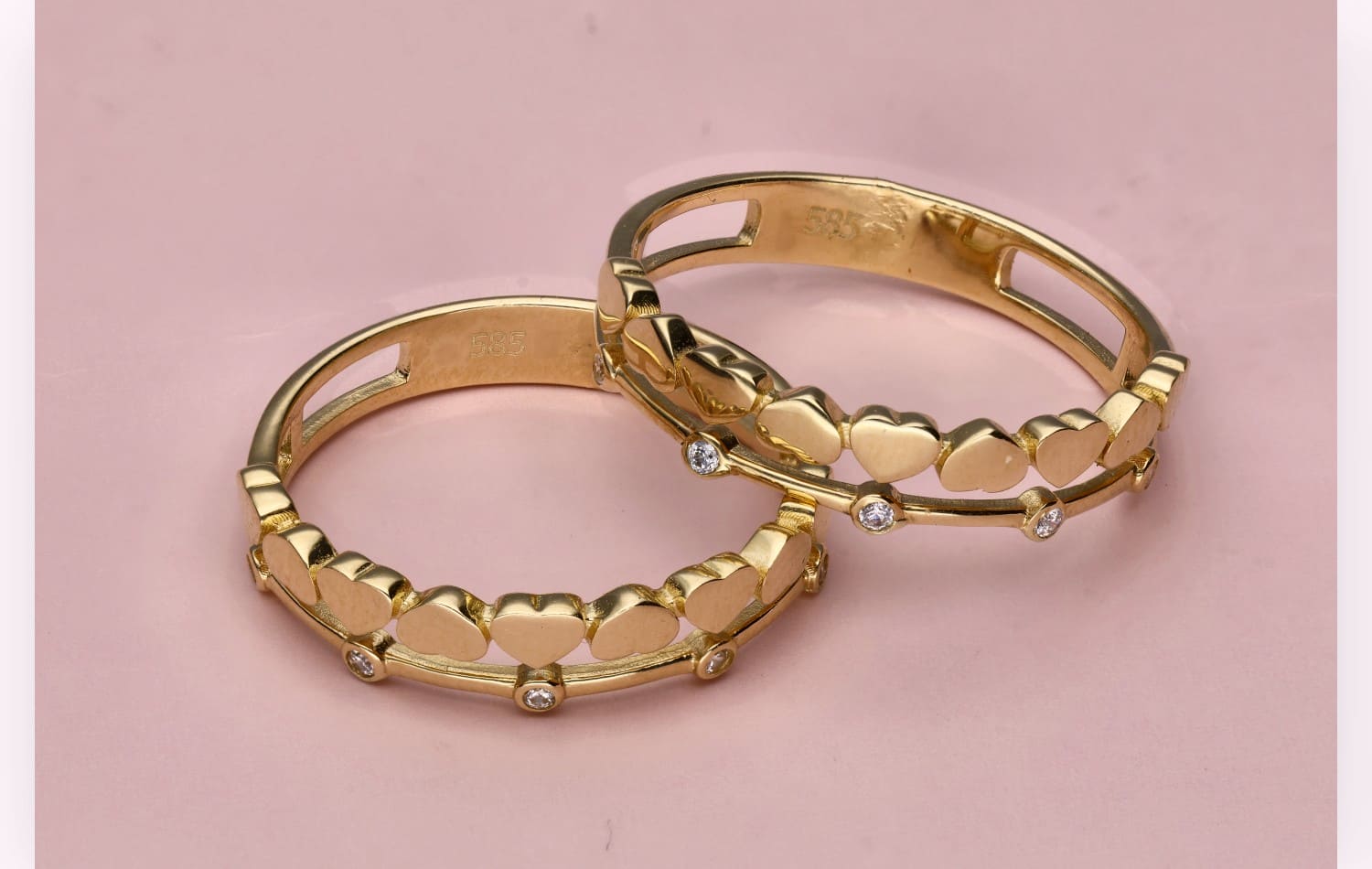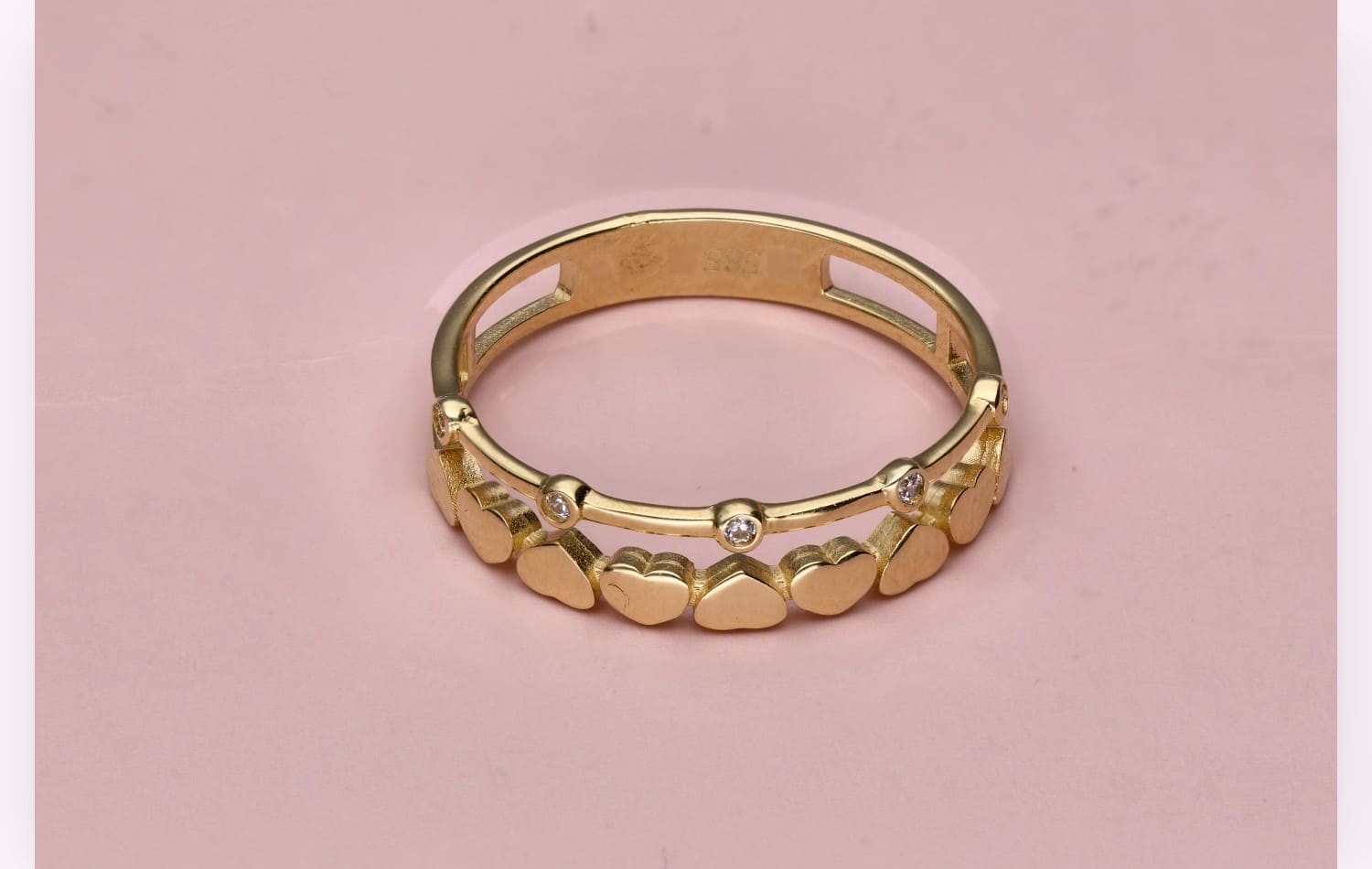 Pierścionek Cherie to subtelna i romantyczna ozdoba, która przyciąga spojrzenia swoim sercem — a właściwie całą ich linią. Delikatne złote serduszka oplatają palec niczym złota koronka, a pomiędzy nimi połyskują drobne cyrkonie, dodając kompozycji subtelnego blasku.