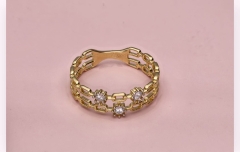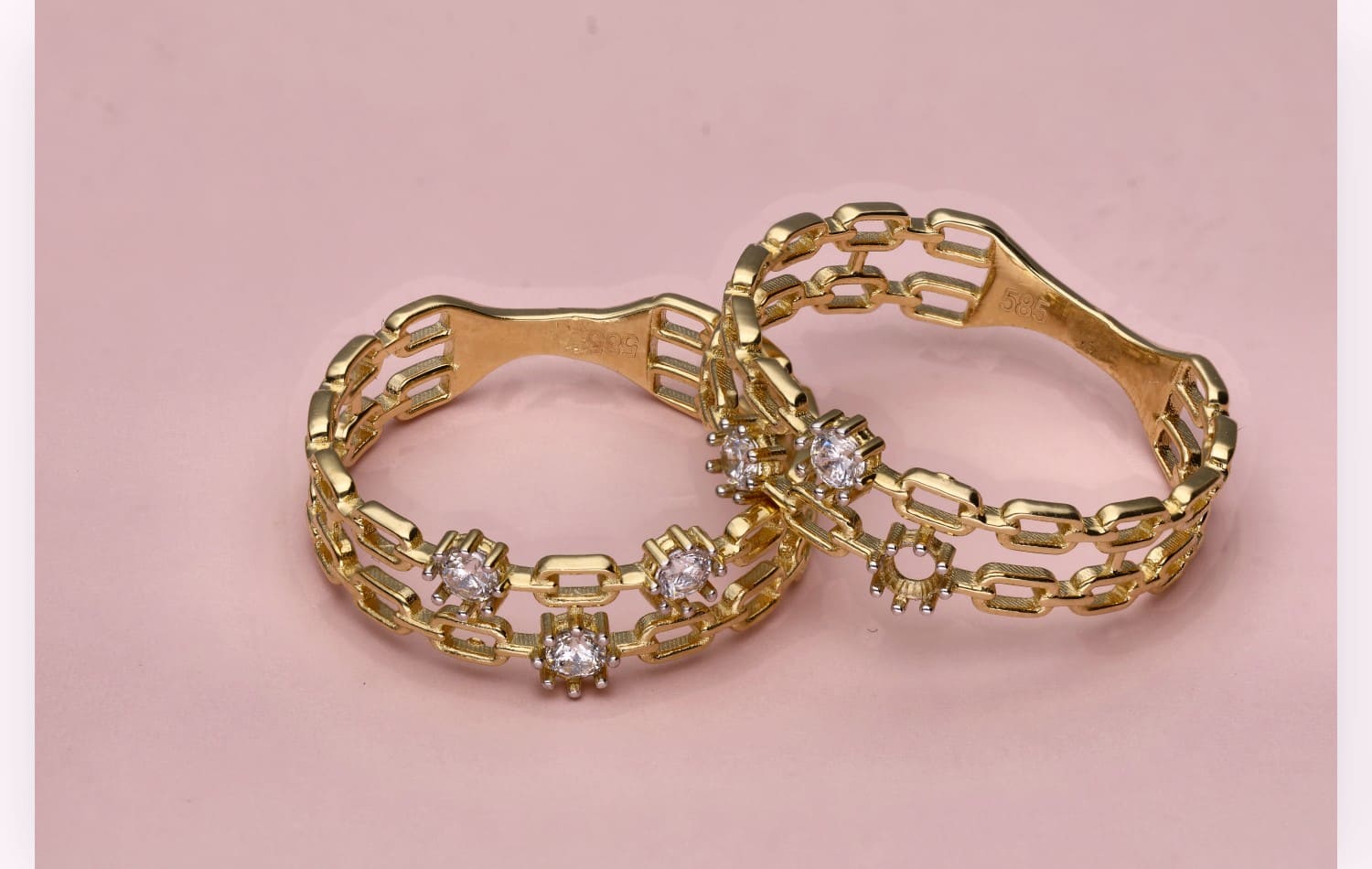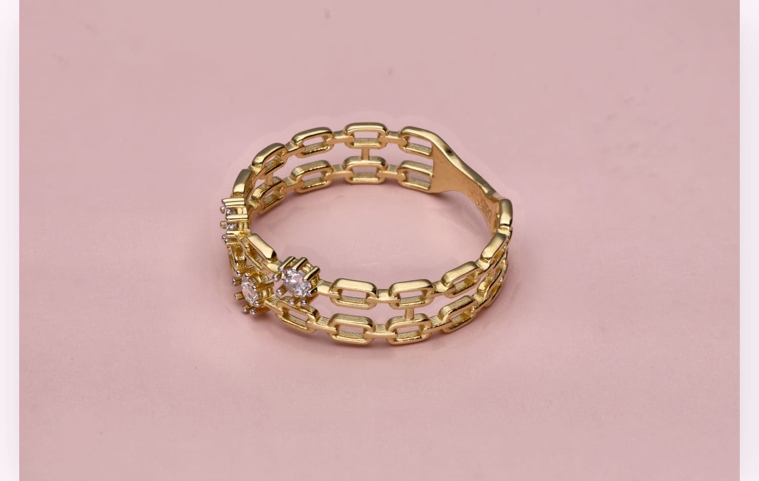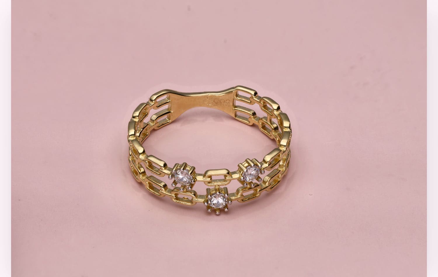 Złoty pierścionek Eclat to subtelne połączenie elegancji i nowoczesności. Delikatna obrączka o strukturze ogniw przyciąga uwagę niebanalnym wzornictwem, a trzy błyszczące cyrkonie w centralnej części dodają mu luksusowego charakteru.