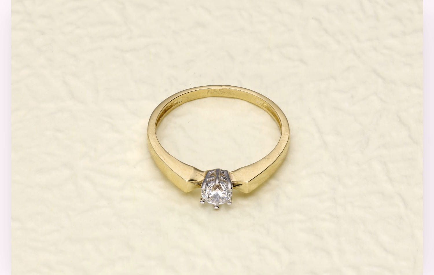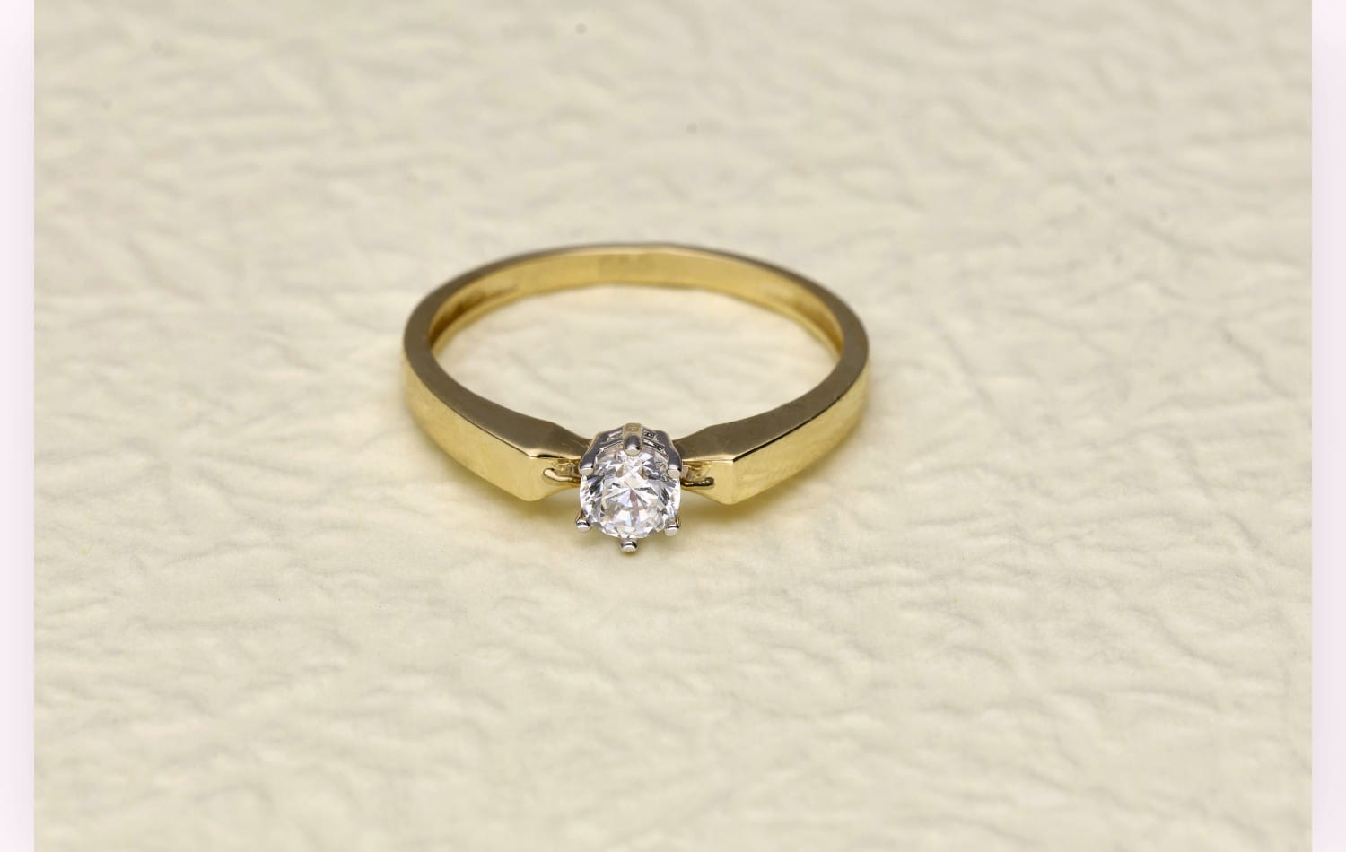 Ten model idealnie wpisuje się w kategorię złote pierścionki zaręczynowe o szlifie brylantowym, zachwycając swoją ponadczasową estetyką i symboliczną prostotą. Złota obrączka o gładkiej powierzchni delikatnie zwęża się ku środkowi, tworząc harmonijną oprawę dla kamienia.