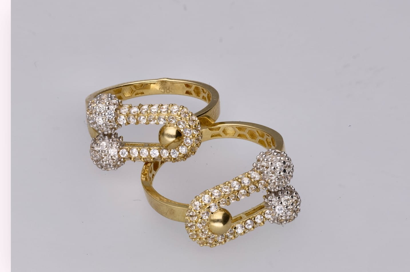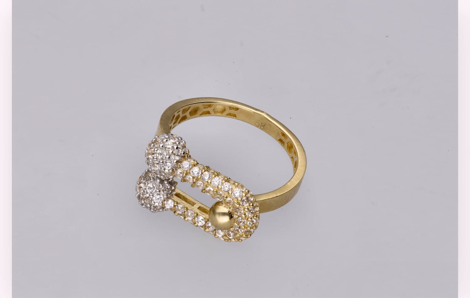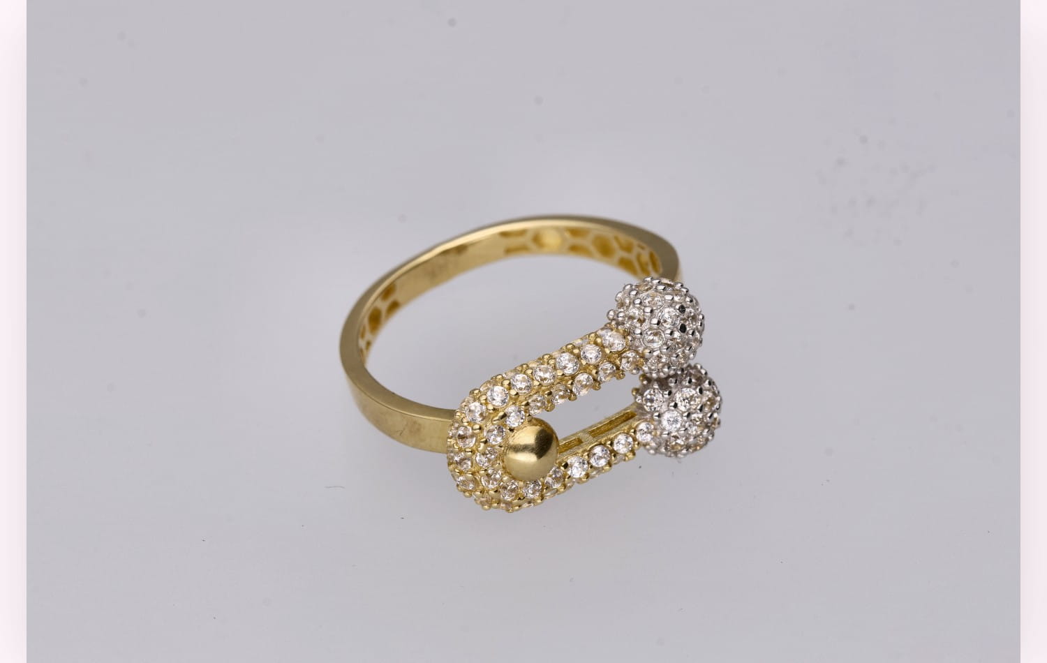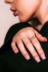Geometryczna forma pierścionka nawiązuje do trendu nowoczesnych złotych pierścionków geometrycznych, dodając stylizacjom świeżości i artystycznego wyrazu. Każdy ruch dłoni wydobywa migotliwy połysk cyrkonii, sprawiając, że pierścionek staje się olśniewającym punktem całej stylizacji.