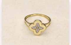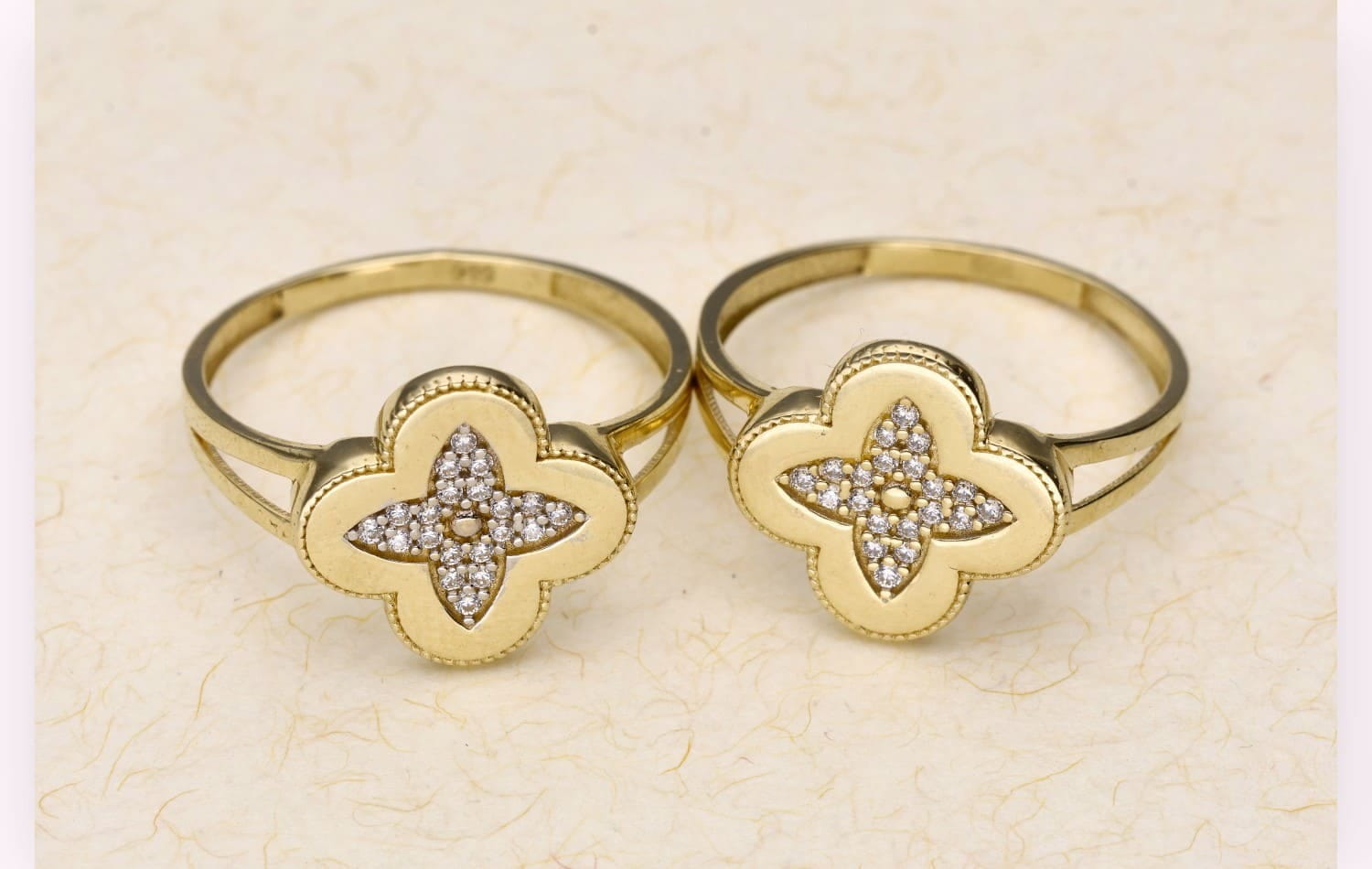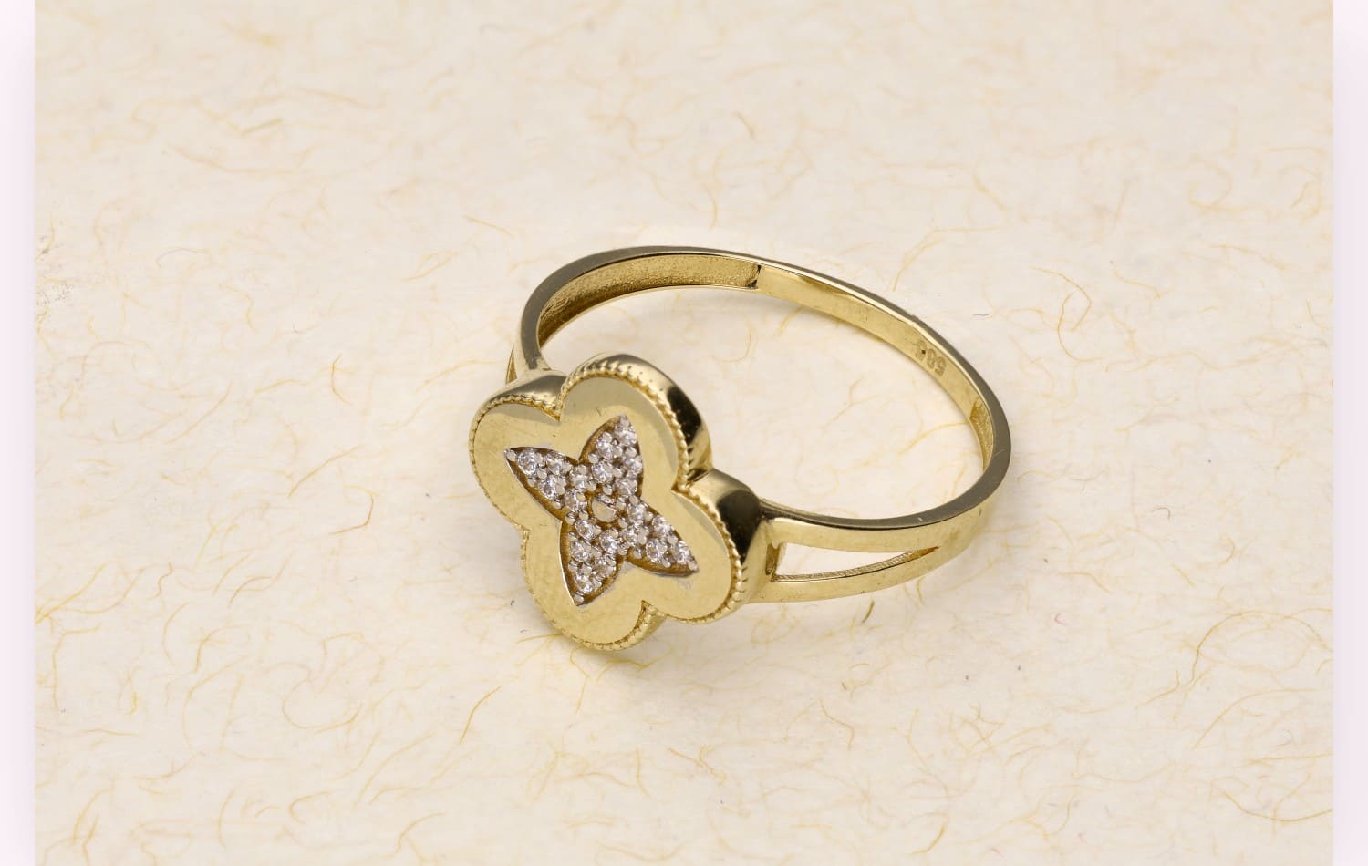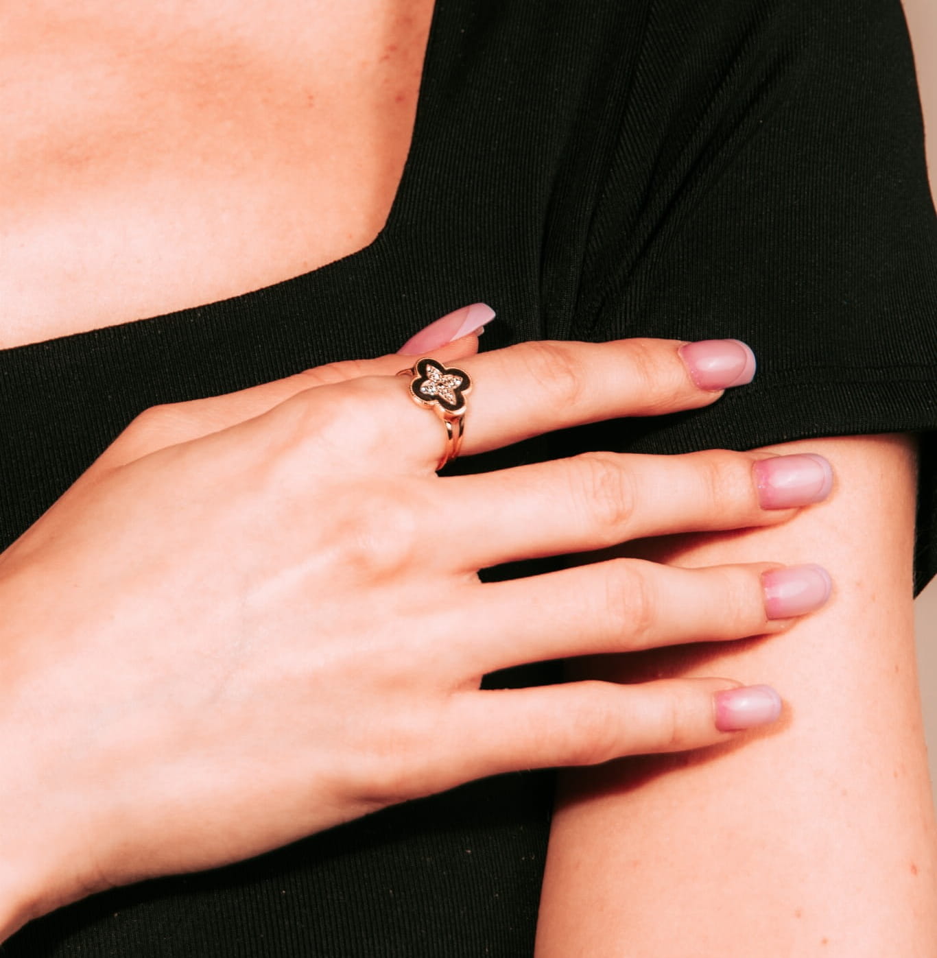 Pierścionek Luxe to esencja wyrafinowanej elegancji — złota obrączka została zwieńczona motywem czterolistnej koniczyny, której wnętrze zdobi misternie ułożona mozaika połyskujących cyrkonii. Każdy detal został dopracowany z niezwykłą precyzją, tworząc biżuterię o ponadczasowym charakterze.