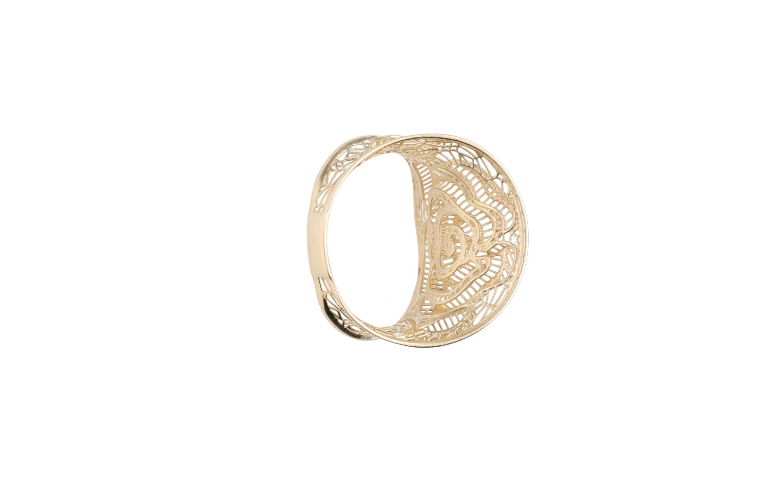 Złoty pierścionek Roselle zachwyca efektownym motywem róży, który nadaje mu romantycznego i jednocześnie wyrazistego charakteru. Ażurowa forma oraz bogate zdobienia tworzą wyjątkową kompozycję pełną detali i głębi. To złoty pierścionek 375, który przyciąga spojrzenia swoją unikalną strukturą i artystycznym wykończeniem. Szeroka obrączka pięknie układa się na palcu, podkreślając jego elegancję. Delikatne wycięcia sprawiają, że biżuteria wygląda lekko mimo swojej wyrazistej formy. Idealny dla kobiet, które lubią biżuterię z charakterem i niepowtarzalnym stylem. Roselle to złota biżuteria, która podkreśla indywidualność i dodaje stylizacji wyjątkowego akcentu.