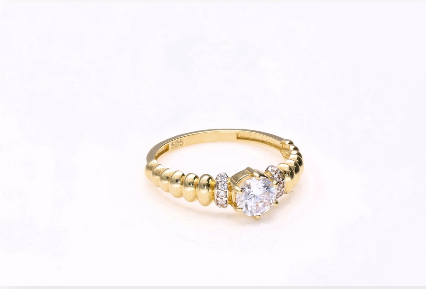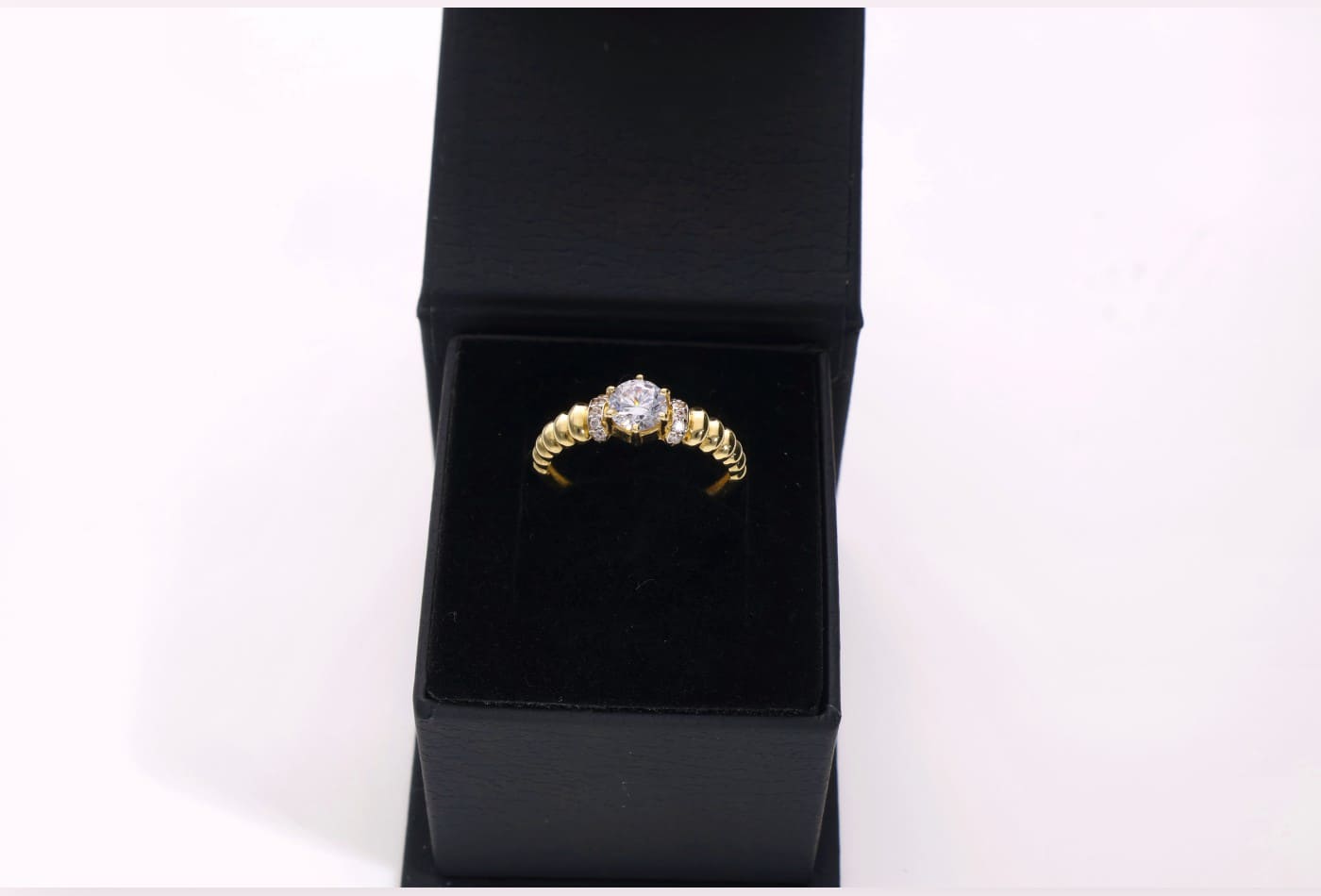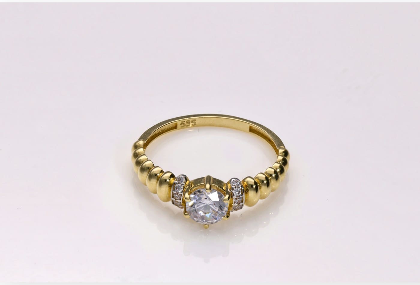 Wytworny złoty pierścionek z cyrkonią to propozycja dla kobiet, które cenią ponadczasową elegancję i wyjątkową jakość. Okrągły kamień otoczony subtelnym wzorem podkreśla blask kamienia, przyciągając spojrzenia i dodając blasku każdej stylizacji. Pierścionek doskonale sprawdzi się jako symbol miłości, idealny na zaręczyny lub jako prezent na wyjątkowe okazje.