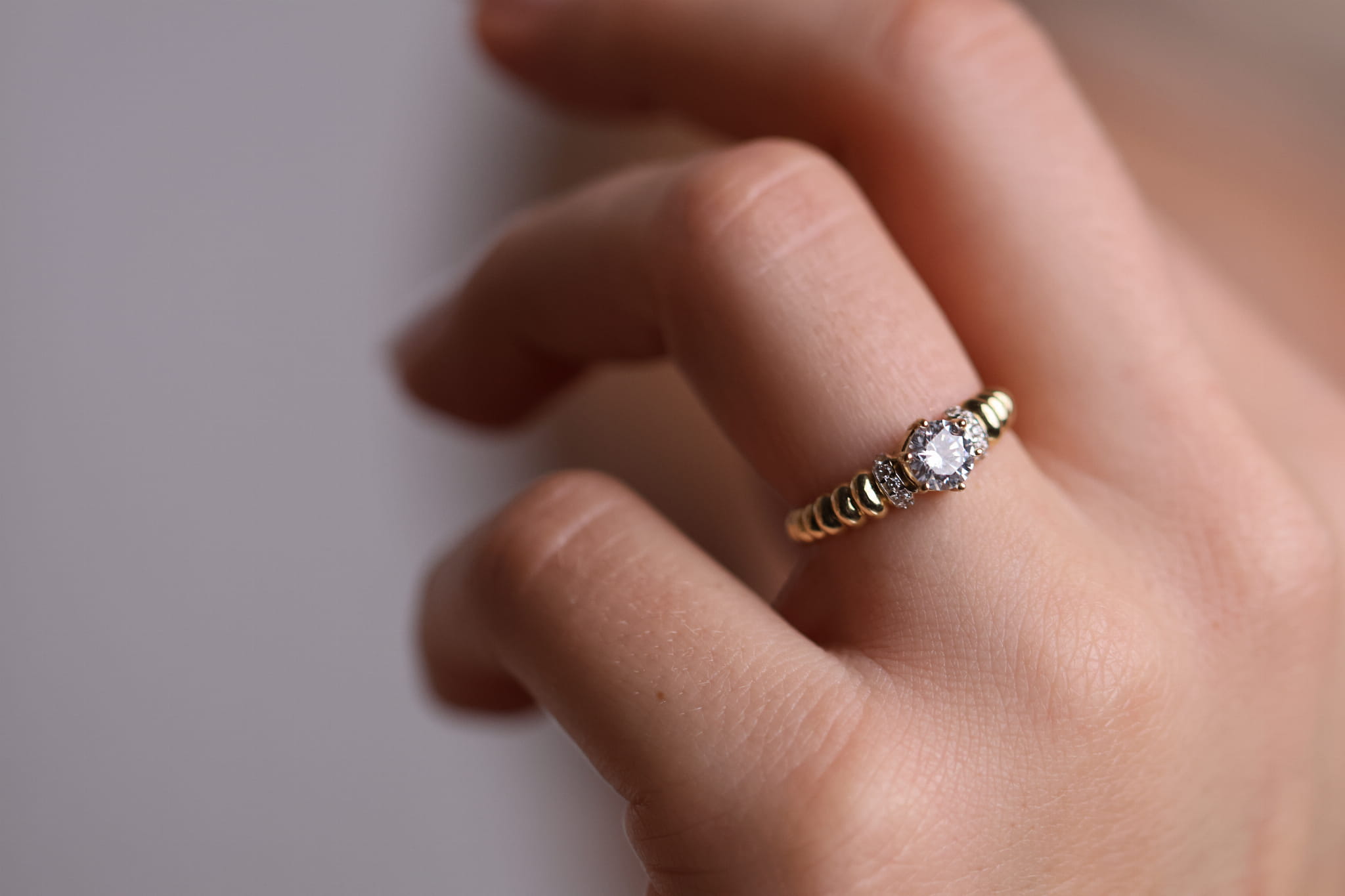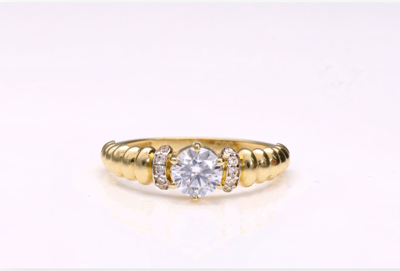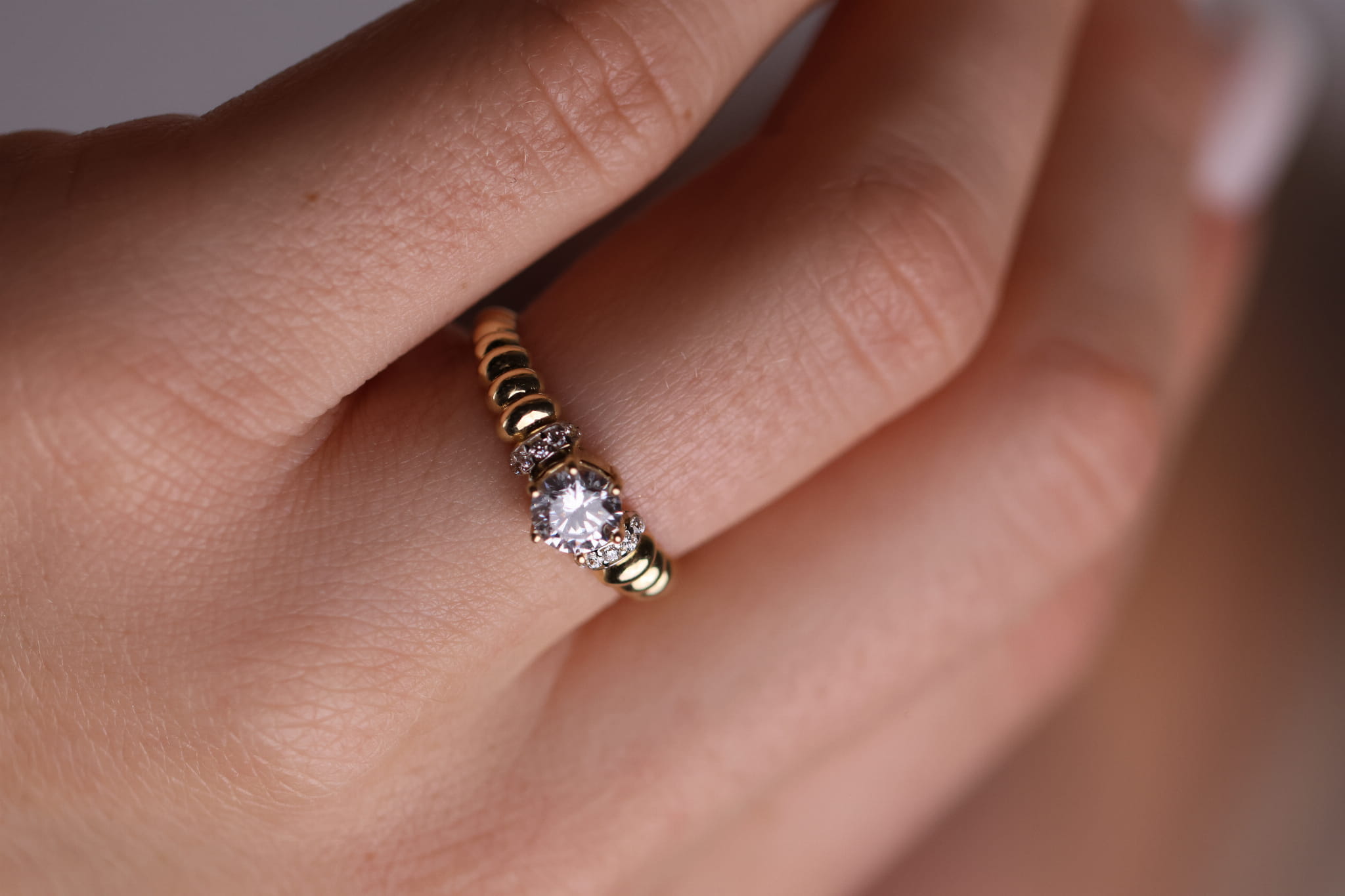 Wytworny złoty pierścionek z cyrkonią to propozycja dla kobiet, które cenią ponadczasową elegancję i wyjątkową jakość. Okrągły kamień otoczony subtelnym wzorem podkreśla blask kamienia, przyciągając spojrzenia i dodając blasku każdej stylizacji. Pierścionek doskonale sprawdzi się jako symbol miłości, idealny na zaręczyny lub jako prezent na wyjątkowe okazje.