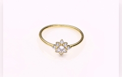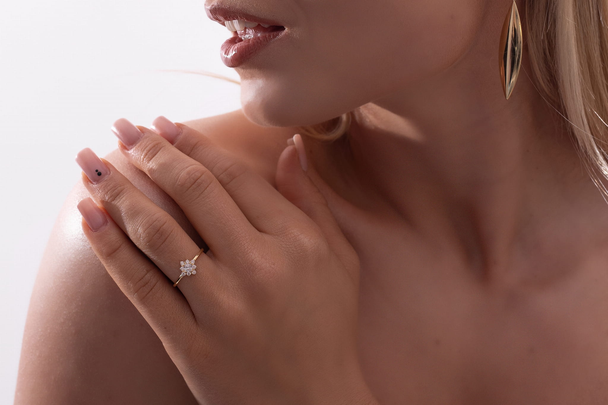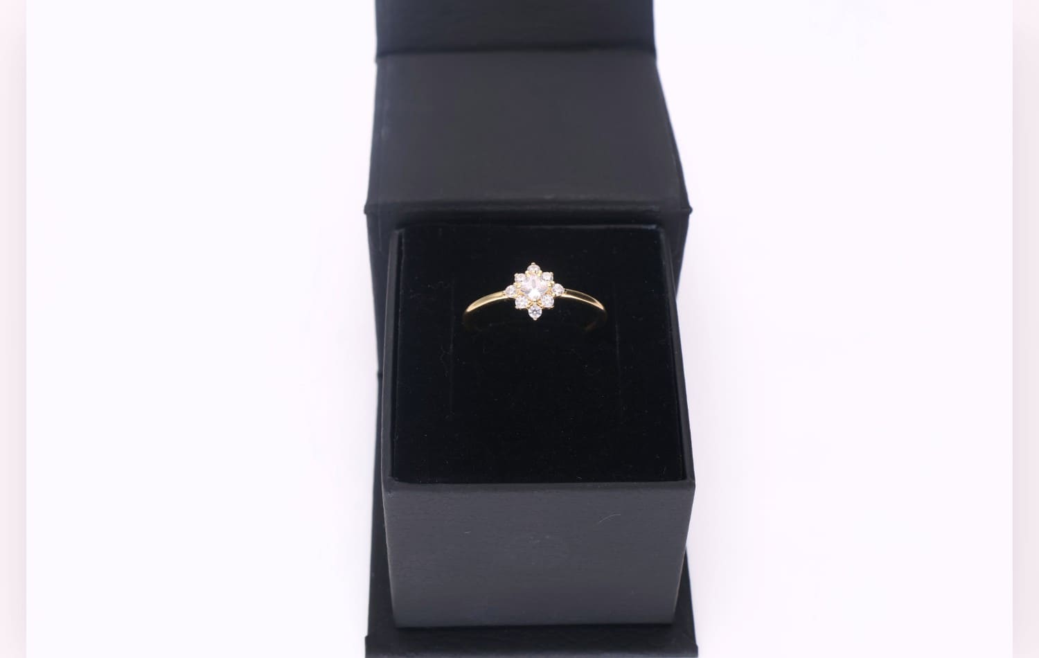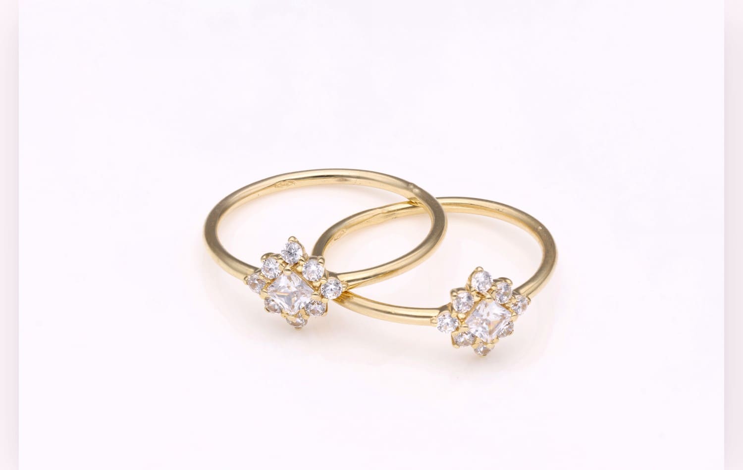 Soft to pierścionek, który urzeka subtelnością i lekkością formy. Centralny kamień o szlifie kwadratowym otoczony jest drobnymi, lśniącymi cyrkoniami, tworząc kompozycję przypominającą rozkwitający kwiat.