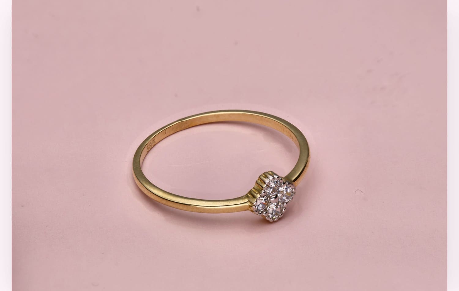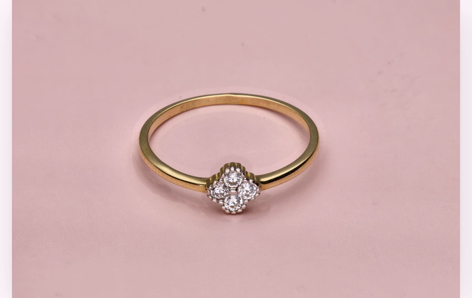 Złoty pierścionek Spark zachwyca subtelnym blaskiem i klasyczną formą. Na delikatnej obrączce osadzono kompozycję z czterech lśniących cyrkonii, które tworzą kształt przypominający drobny kwiat. Ich precyzyjne osadzenie pięknie odbija światło, nadając biżuterii wyrafinowanego uroku.